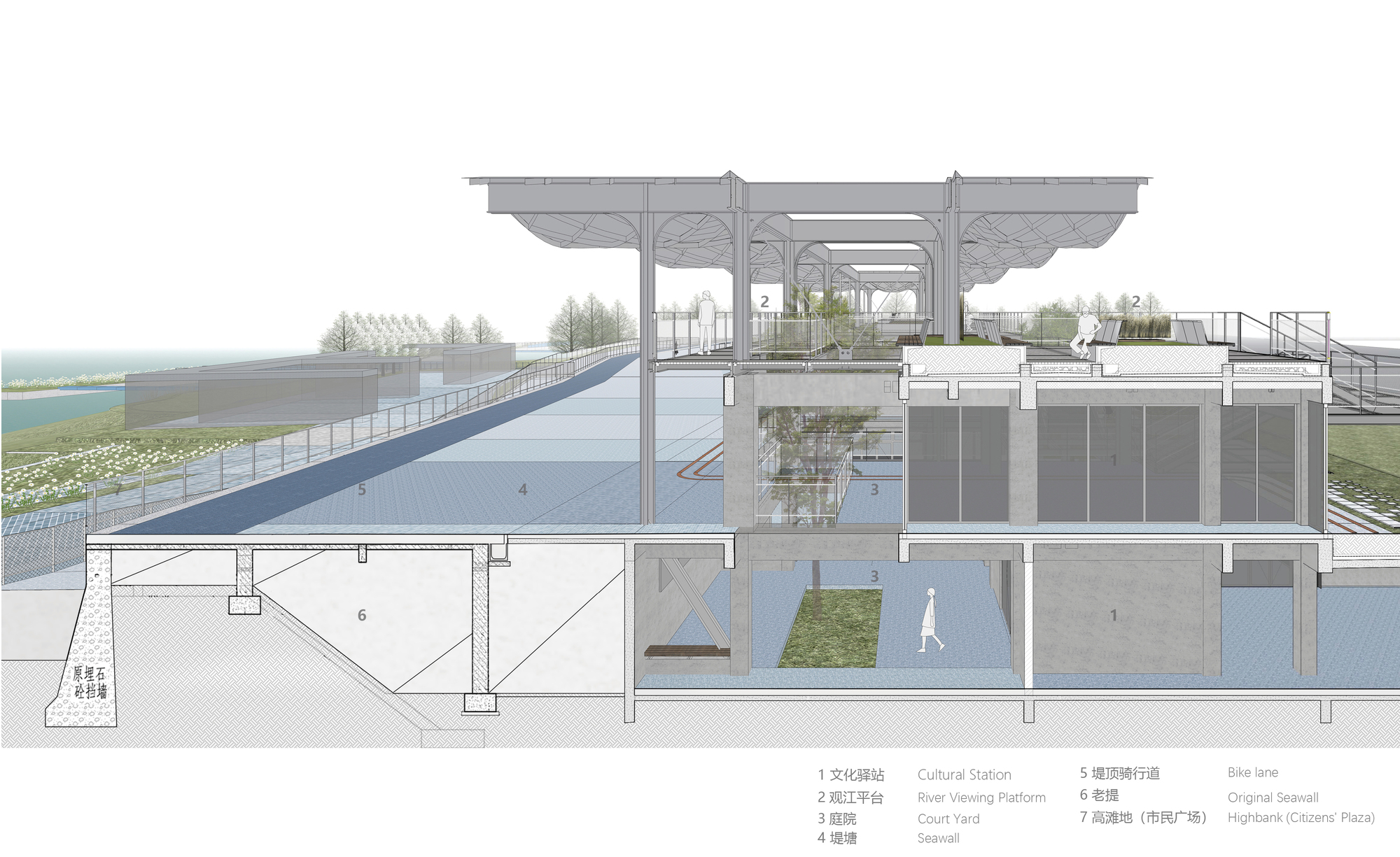 為最大化延續現有建築的歷史與物質價值,設計團隊決定採取大膽的結構改造。在經過精確的結構評估和江城連結視線分析後,原有的四層建築被水平削切至僅剩兩層,並在垂直方向打通六條垂江通道,以重新建立城市與江景的聯繫。
