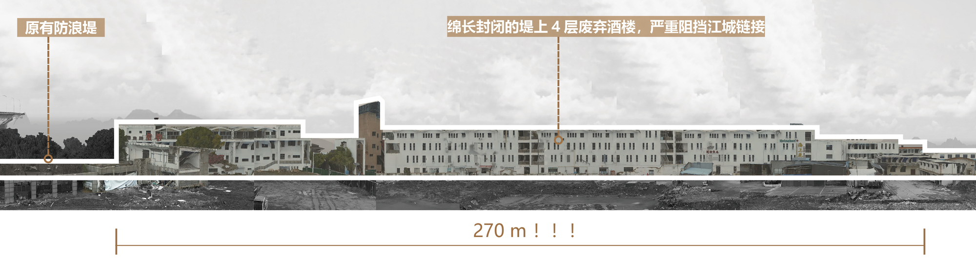 舊建築改造前的江畔地帶,面臨著嚴峻的空間限制。原有的海塘防浪堤高聳孤立且綿長,堤頂空間極為狹窄,導致城市與江岸之間的連續性蕩然無存。更糟的是,堤上遺留兩座棄用的四層樓建築,面寬長達二七○米,如同一堵高牆,嚴重阻礙了城市與椒江之間的視覺及步行聯繫。