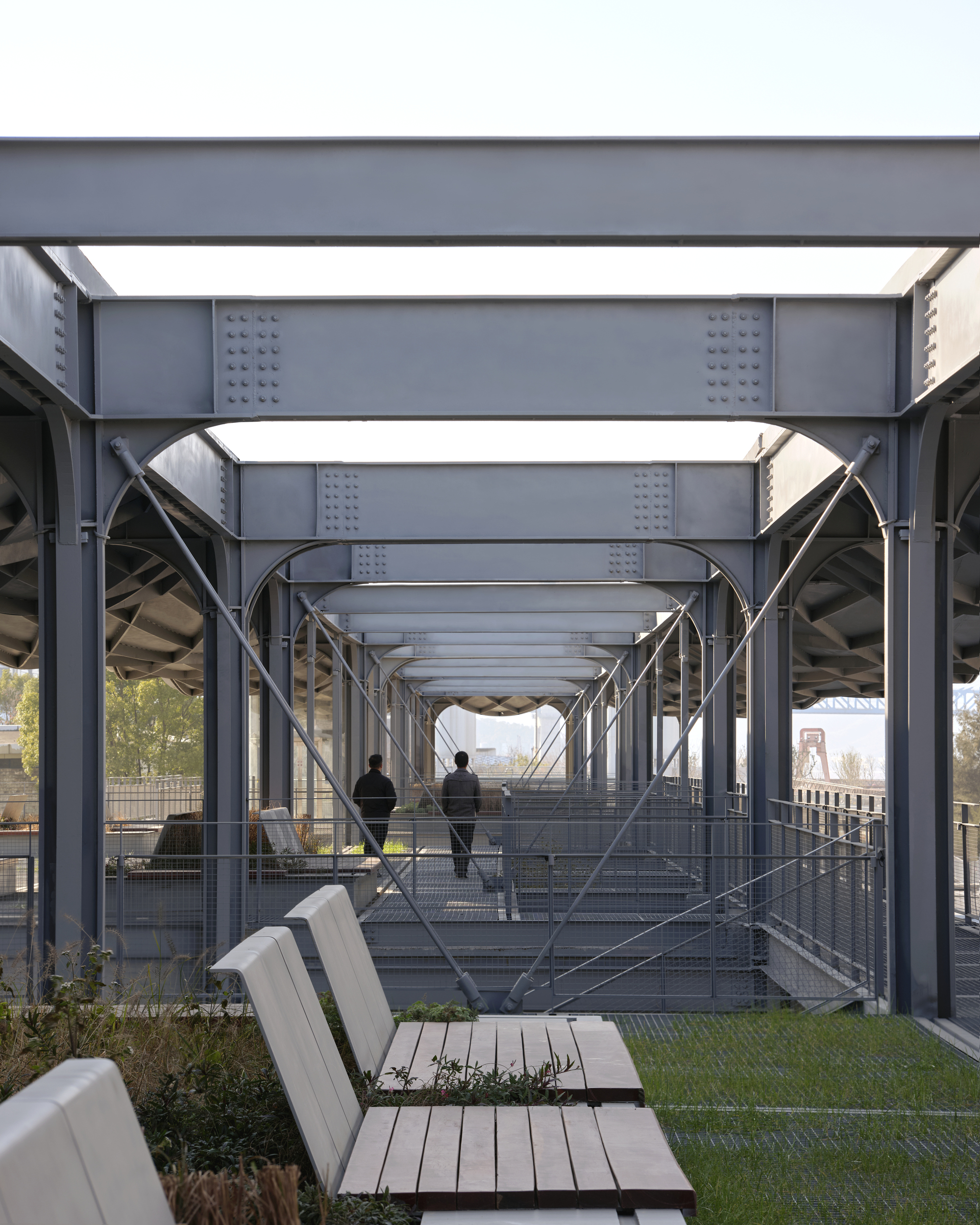 剩餘結構被局部切割,形成七組內向的院落空間。在拆除部分混凝土結構時,設計刻意保留了部分老牆與梁頭,讓新增的結構得以續接。新舊結構之間的層疊並置,採用了鋼材的輕盈與原有混凝土的粗獷,提供了光陰層疊的氛圍感。這些被保留的歷史痕跡,承載著院落中綠植的光影,讓過去的物質性得以在當下被多重感知。