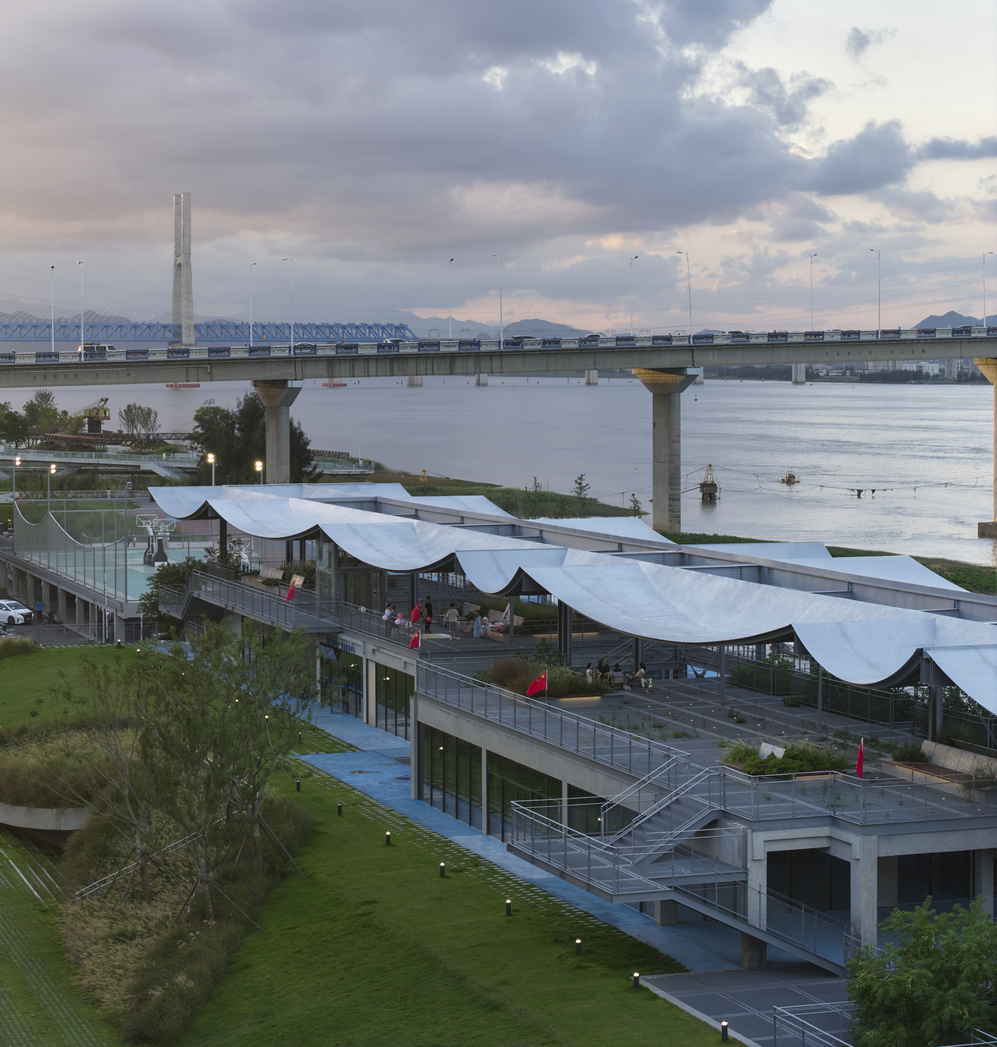 室內空間則合宜地容納了水利文化展覽、市民驛站、運動空間與水利管理用房。傍晚時分,燈光漸亮,立體漫步系統串聯堤內堤外,成為知名的江畔賞景打卡地,印證了建築已真正地融入日常,彷彿它本就生長在椒江灣畔。