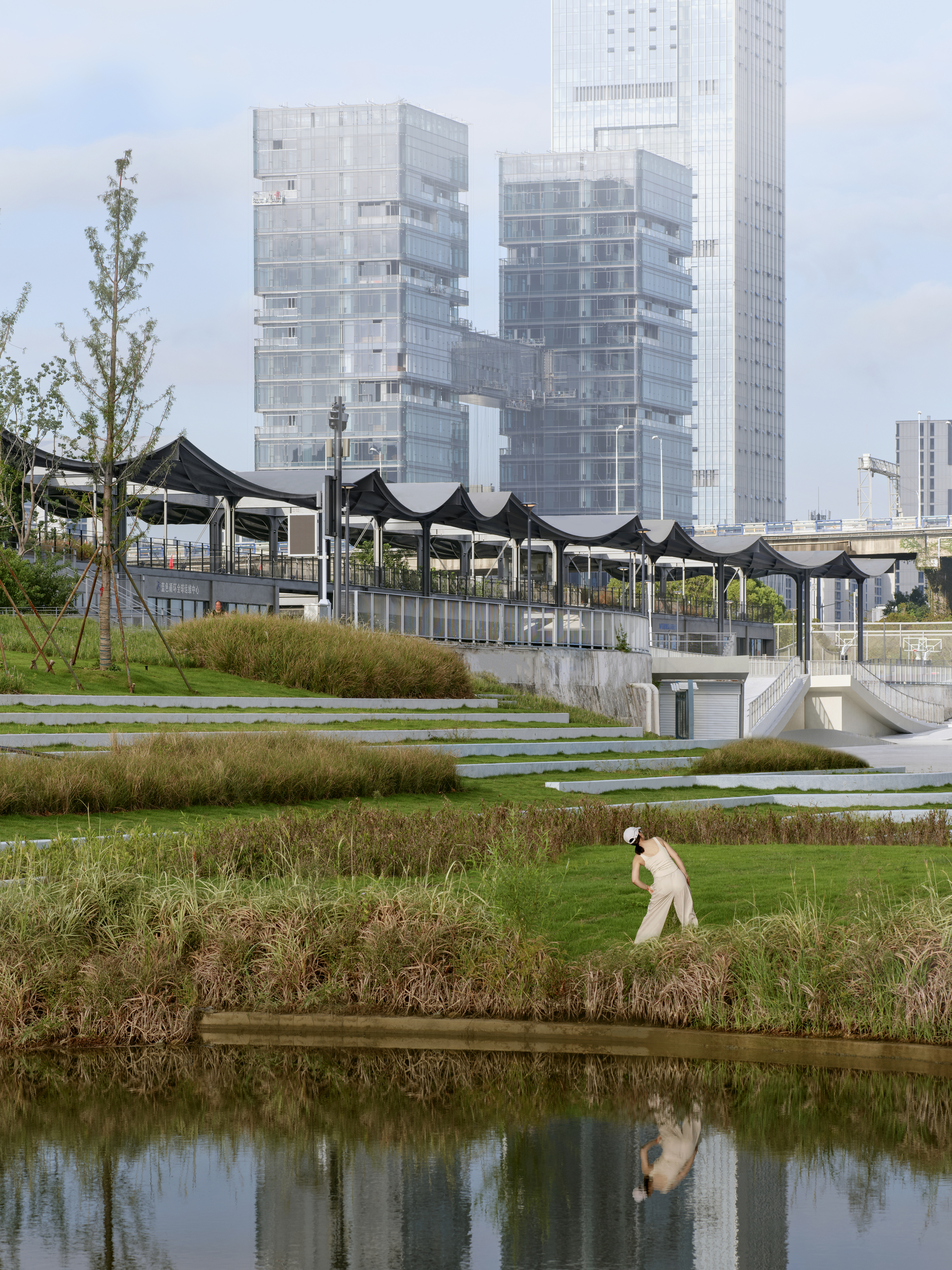 建築師的當務之急是系統性地梳理基地場域,將堤頂空間拓寬至十二米以上,增設多種上下聯通的方式。這種策略旨在將原有的線性屏障,轉變為多路徑的漫遊場域,甚至連堤外停車場也以緩坡覆蓋,有序地銜接至和合大道的車流動線。
