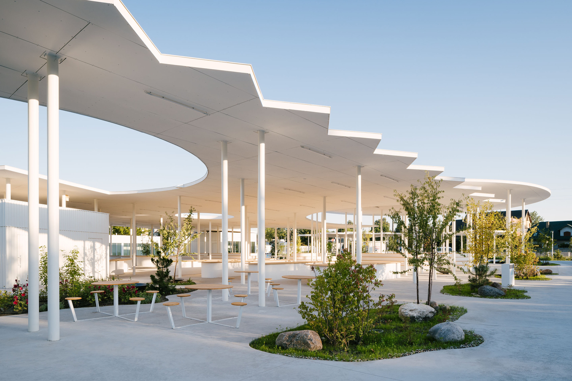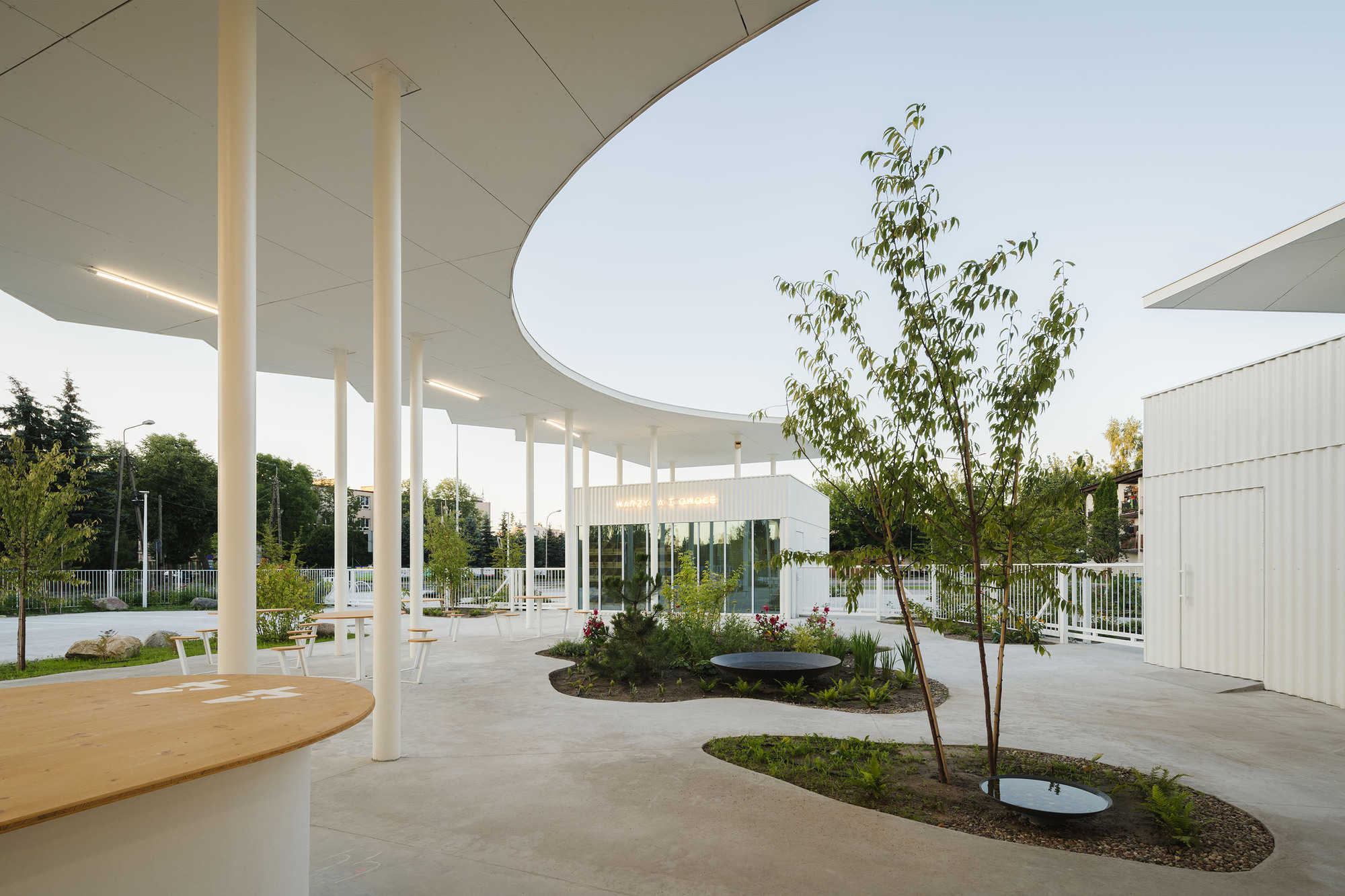 當市集休市,喧囂散去,那些原本用來陳列商品的階梯式木質檯面,搖身一變成為居民閒話家常的座椅與聚會場所。這種多功能的設計巧思,讓空間的使用時間被無限延長,不再受限於商業活動的鐘點。圍繞著核心區域,設置了配備大面窗戶的商業服務亭,外牆覆蓋著波浪狀的白色金屬板,與周遭環境形成一種既現代又和諧的對話關係。