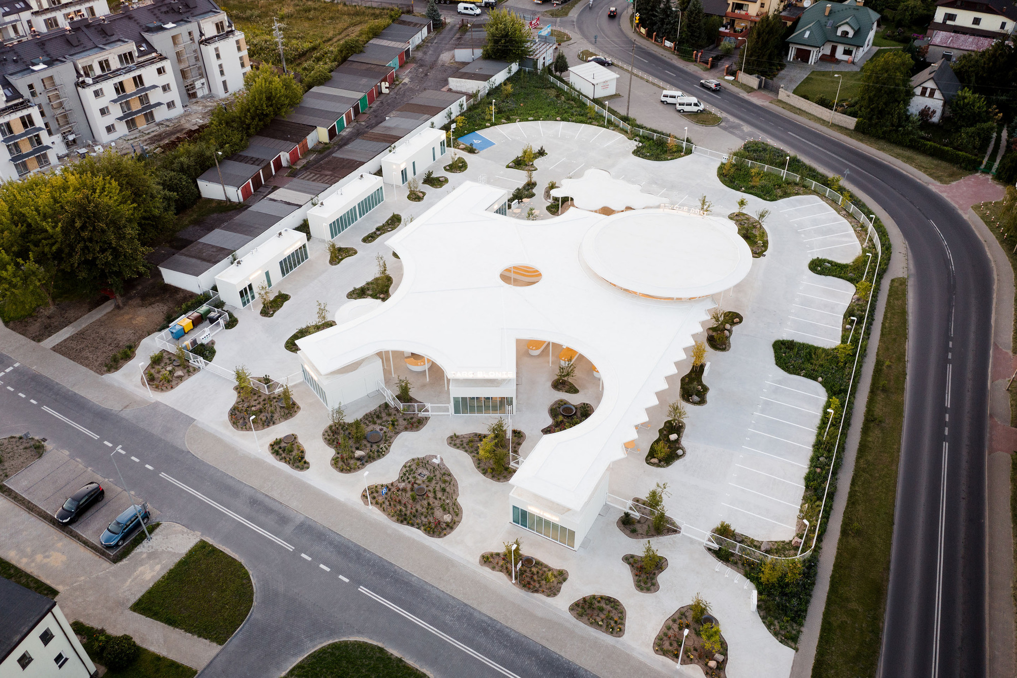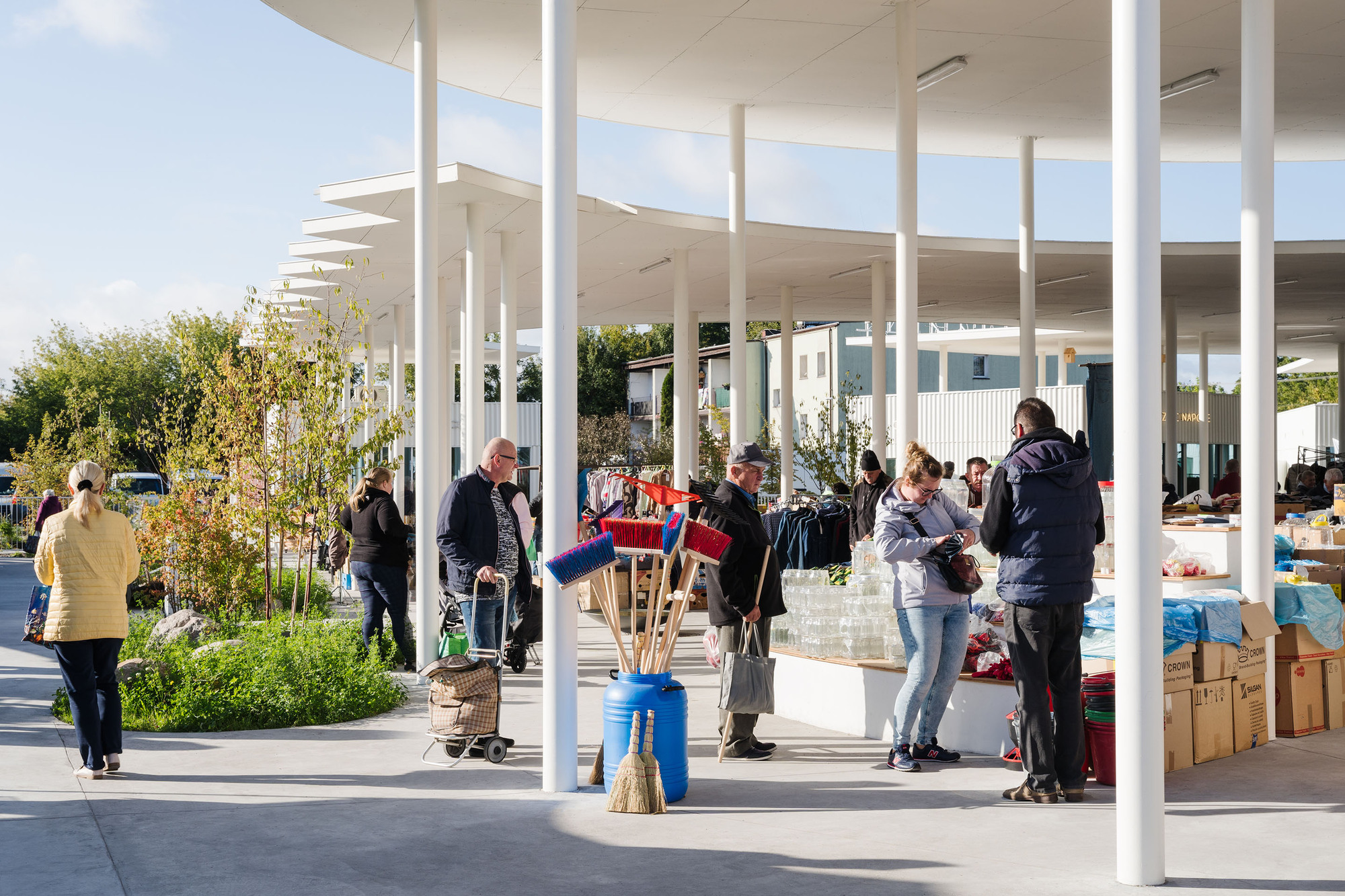 在華沙近郊小鎮的日常風景間,Aleksandra Wasilkowska 植入結合公園綠意與熱絡買賣的混合地景,讓流動攤販與社區居民在光影交錯的幾何量體間重拾鄰里共好