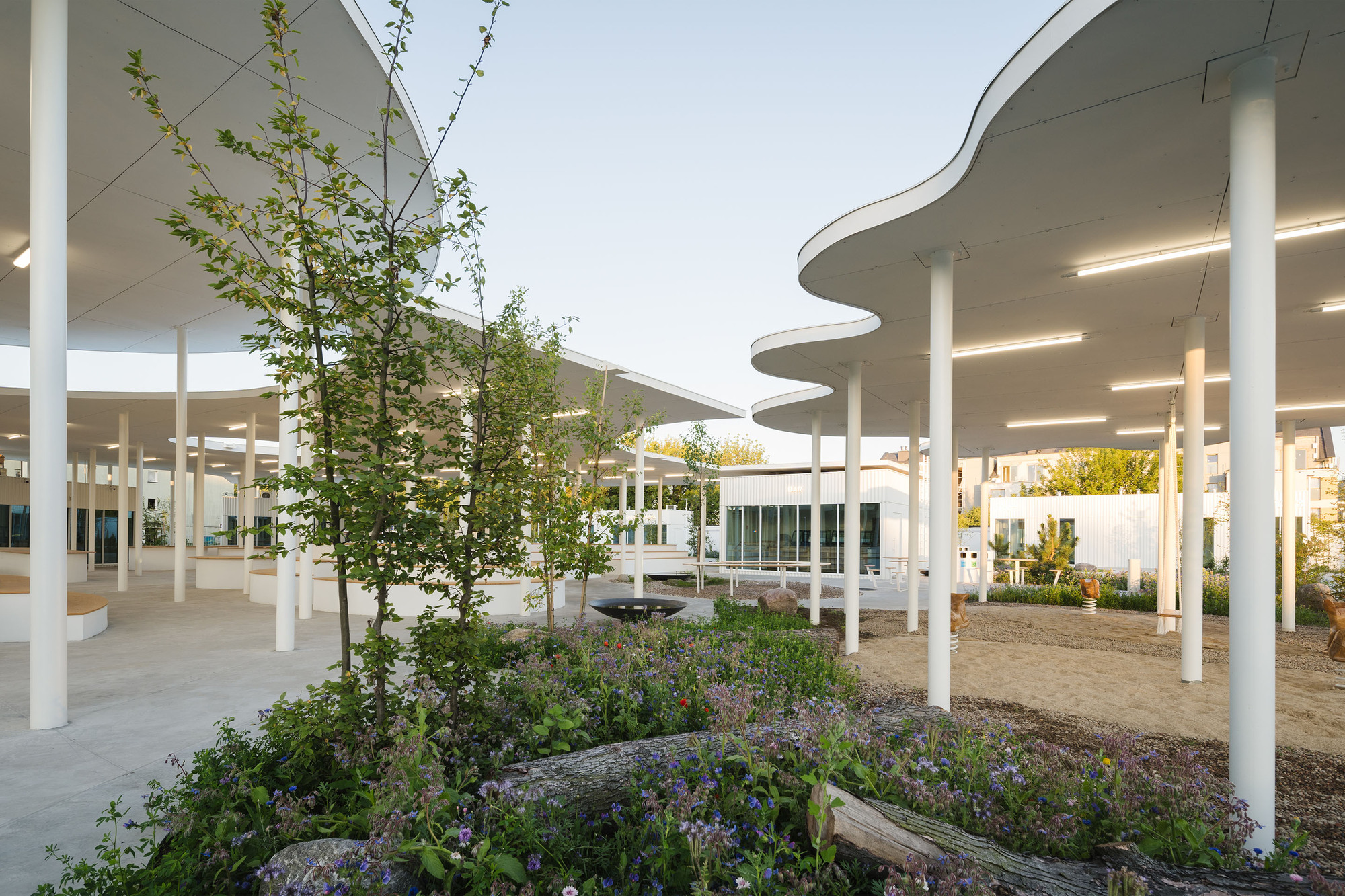 這項改造計畫的核心精神,在於將原本硬鋪面的廣場進行「再自然化」(Renaturalization),提升當地的生物多樣性。設計師在屋頂與涼亭周圍,精心配置了充滿野趣的綠色島嶼,種植了松樹、多莖的角樹(Hornbeams)、山毛櫸與榿木(Alders)。