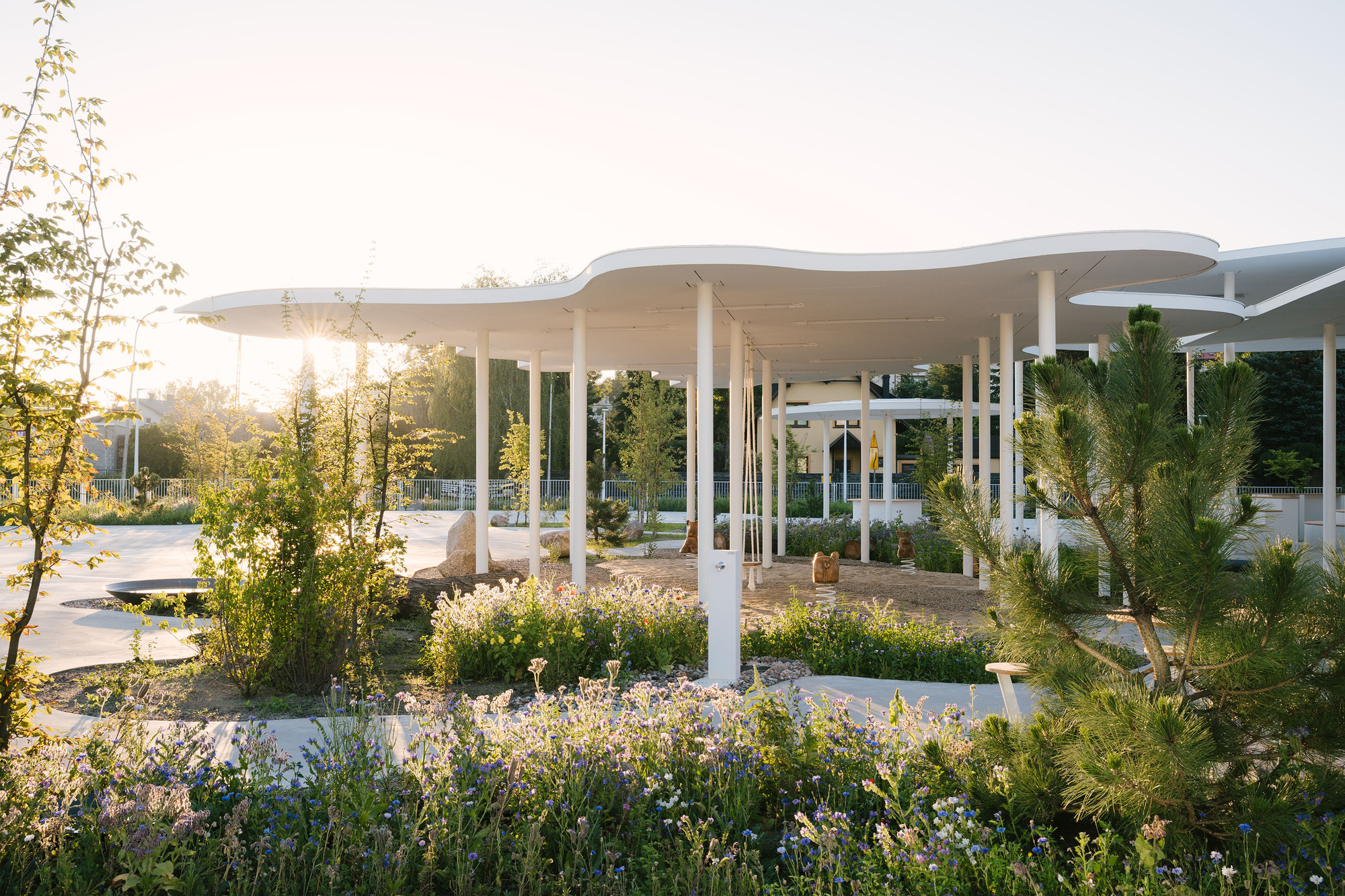 整個場域的設計細節,透過一系列訂製的街道家具畫龍點睛。白色的圓形資訊看板、自行車架、散落的巨石,以及專為鳥類與昆蟲設計的小屋,共同建構出一種友善且包容的微型生態系。特別是在那獨特的有機造型屋頂下,設有一處充滿童趣的遊戲花園,配置了木雕動物造型的搖搖椅,讓孩子們的歡笑聲穿梭在市集的叫賣聲中。