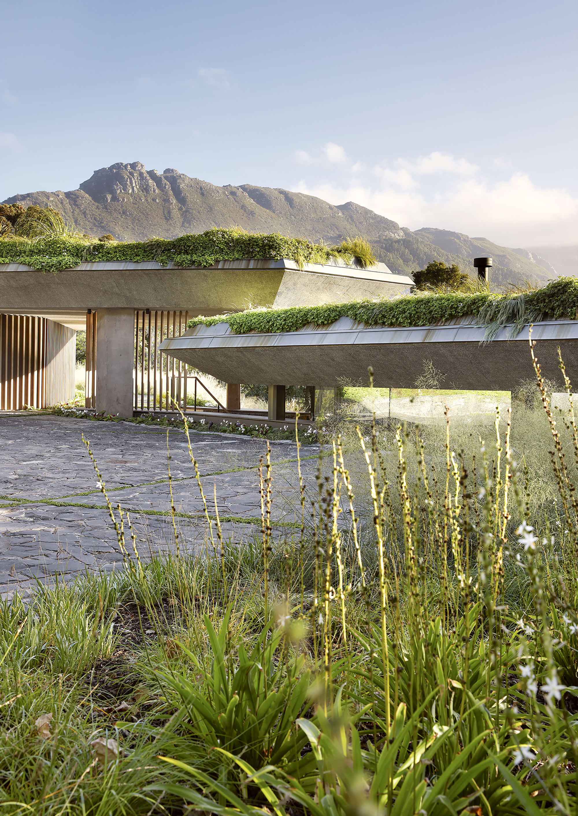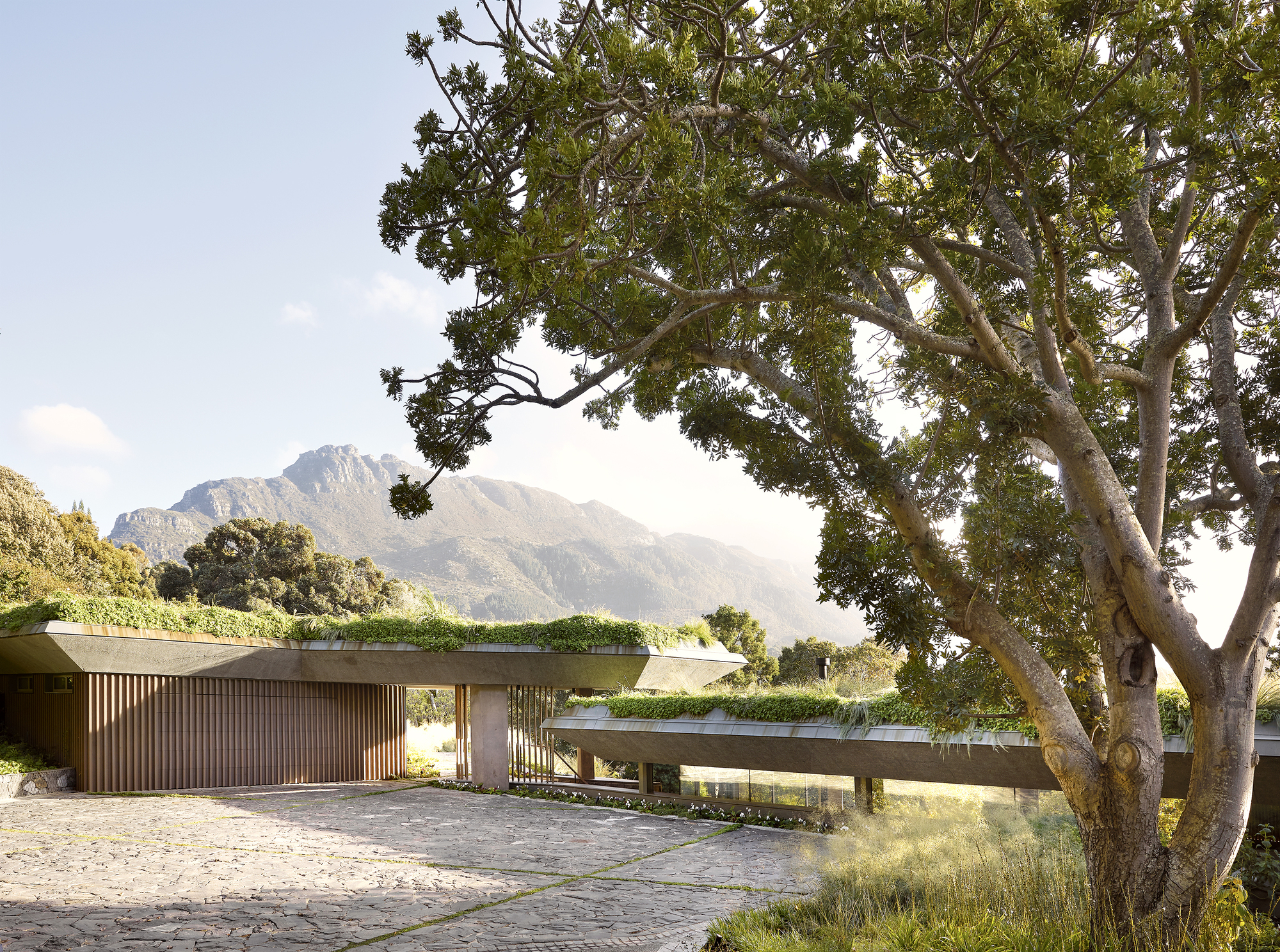 面對陡峭的山坡地勢,南非建築師事務所Malan Vorster Architecture Interior Design選擇將新建築隱藏於地形之中,使其平順地嵌入自然環境。這種低調的設計策略不僅保留了土地原有的生態景觀,更透過建築的高度位置為住戶提供了俯瞰桌山的壯麗景觀。玻璃幕牆的使用進一步加強了建築與外部環境的視覺互動,使內外空間自然融合,營造出沉浸式的景觀體驗。