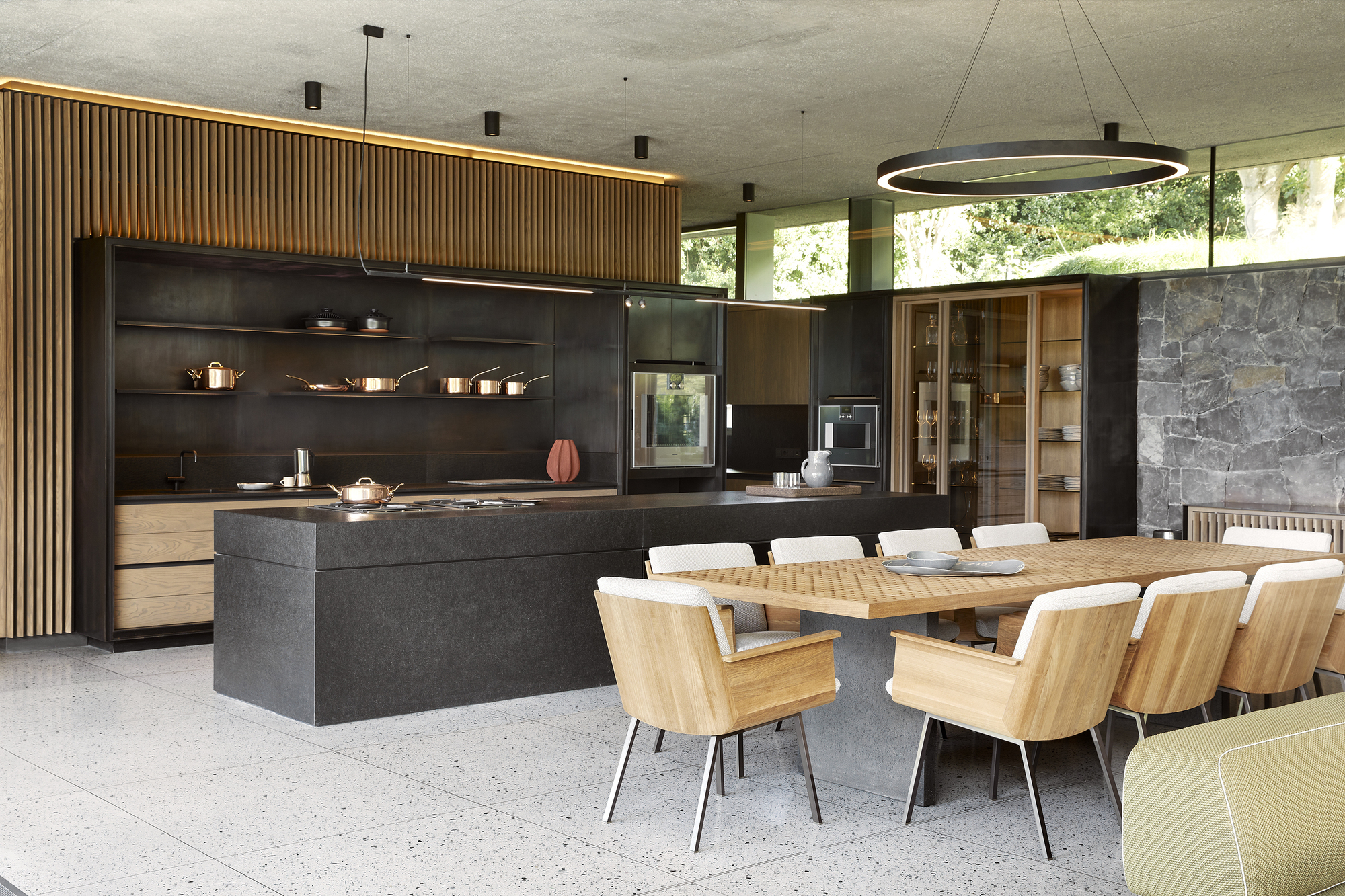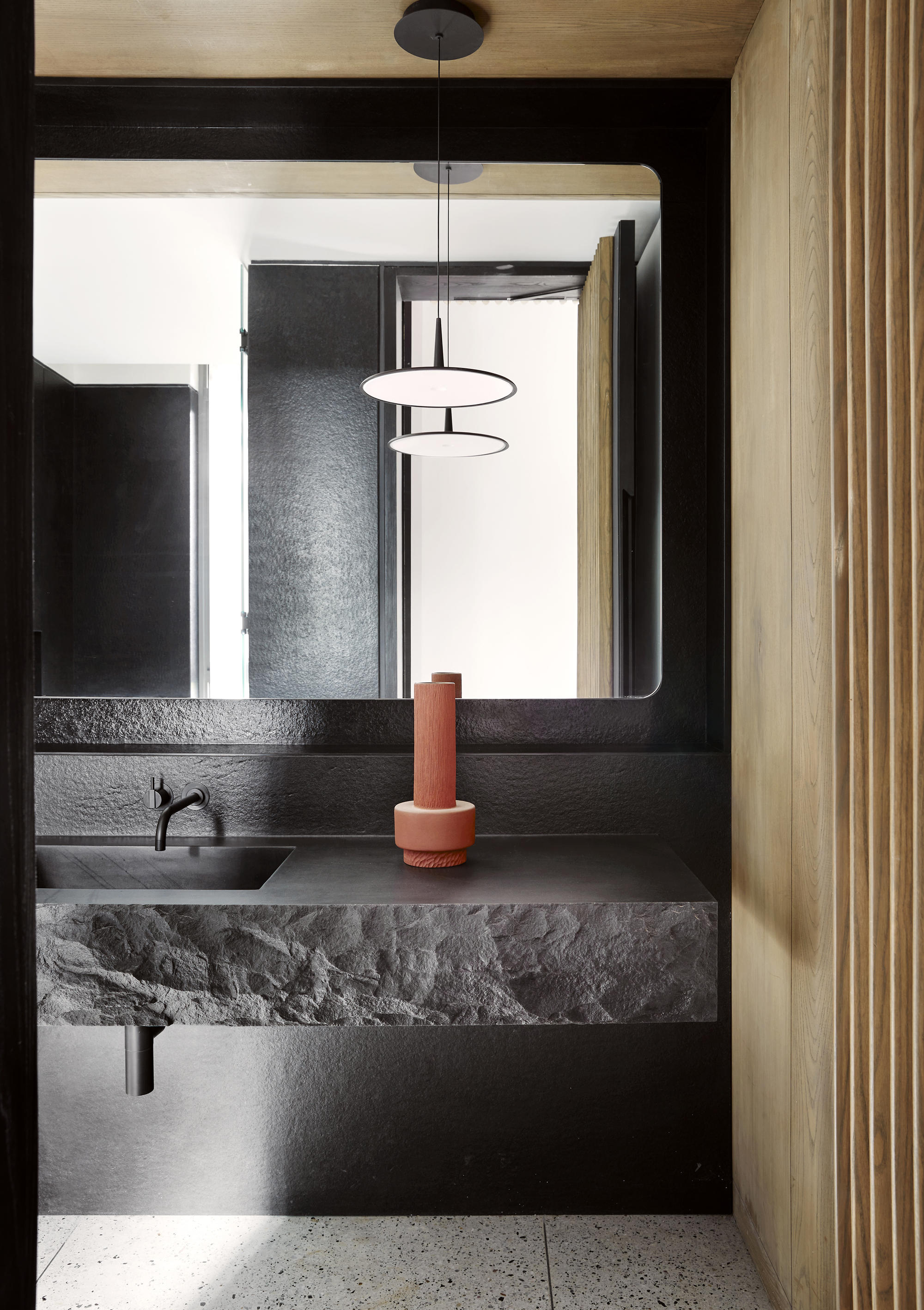 建築的核心結構以砂岩質感的混凝土呈現,其表面經過噴砂處理,模擬在地石材的粗糙質地。結合天然板岩與光滑的磨石地板,整體設計透過對比與細緻觸感營造出豐富的視覺與觸覺層次。這些材料不僅提升建築的耐久性,也與周遭地景融為一體,進一步強調了與自然對話的可能性。