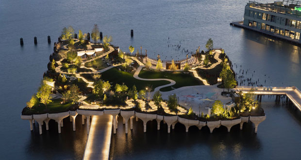 這個位於紐約哈德遜河之上的公園佔地約9710平方公尺,並以沉浸式體驗的形式將藝術和自然帶到這片「小島」之上。「小島」所創建的微環境藉由其顏色、材質、光線和陰影逐步展示在了大眾面前。人們無論是沿著蜿蜒的小路、階梯還是巨石前行,他們的視線中始終有著豐富色彩的植栽,並可以向遠眺望城市和港口的壯麗景色,採用3D和預鑄混凝土,包括687座圓形劇院,種植近400種植栽。