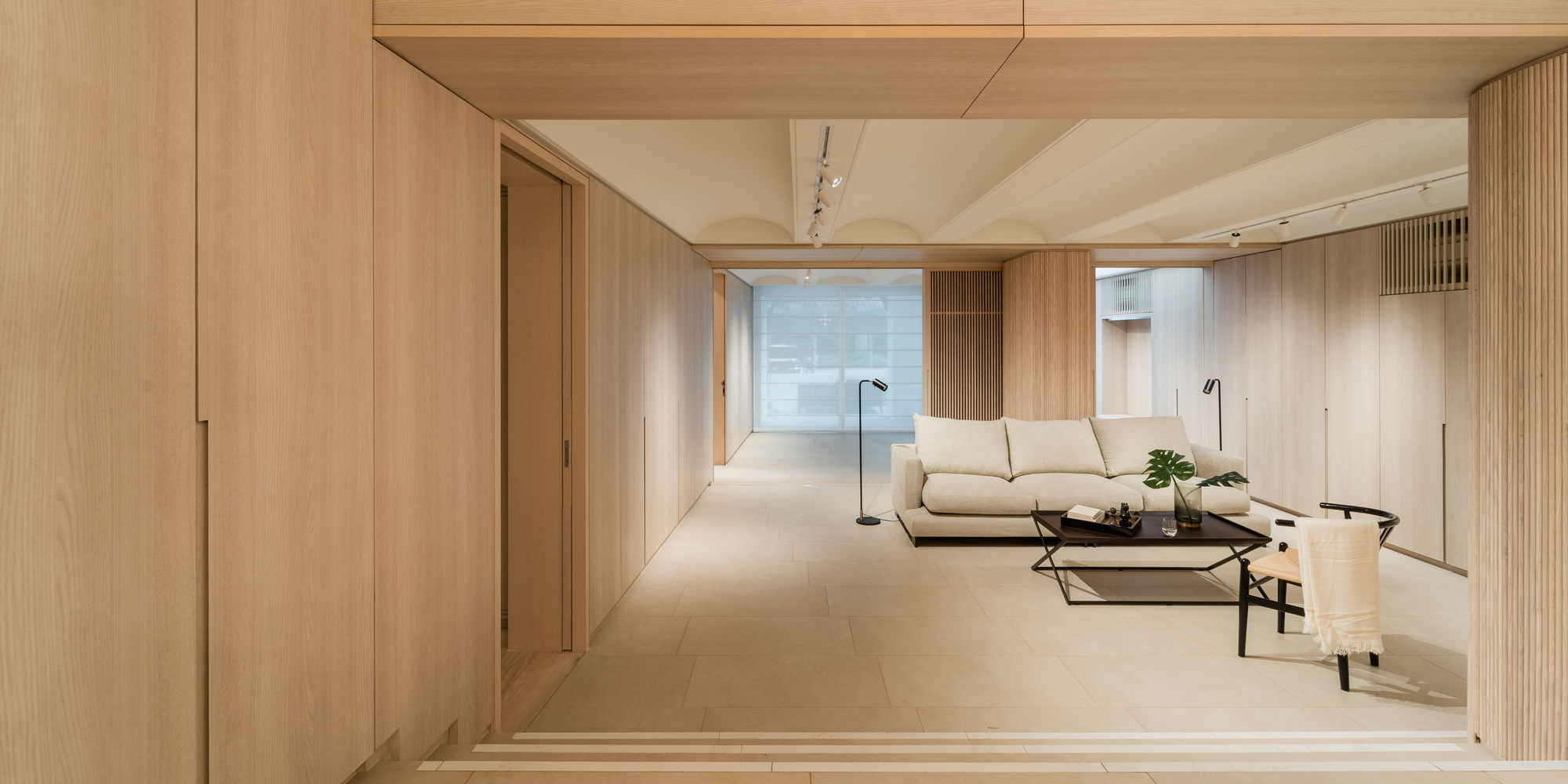 被溫潤木材包覆的門型框架,在無形中柔和地劃分出三種截然不同的空氣場域,帶出循序漸進的感官體驗。每個階段皆配備量身訂做的天花板構造,使原本肉眼無法察覺的空氣品質與流動狀態,轉化為具體可見的建築表情。