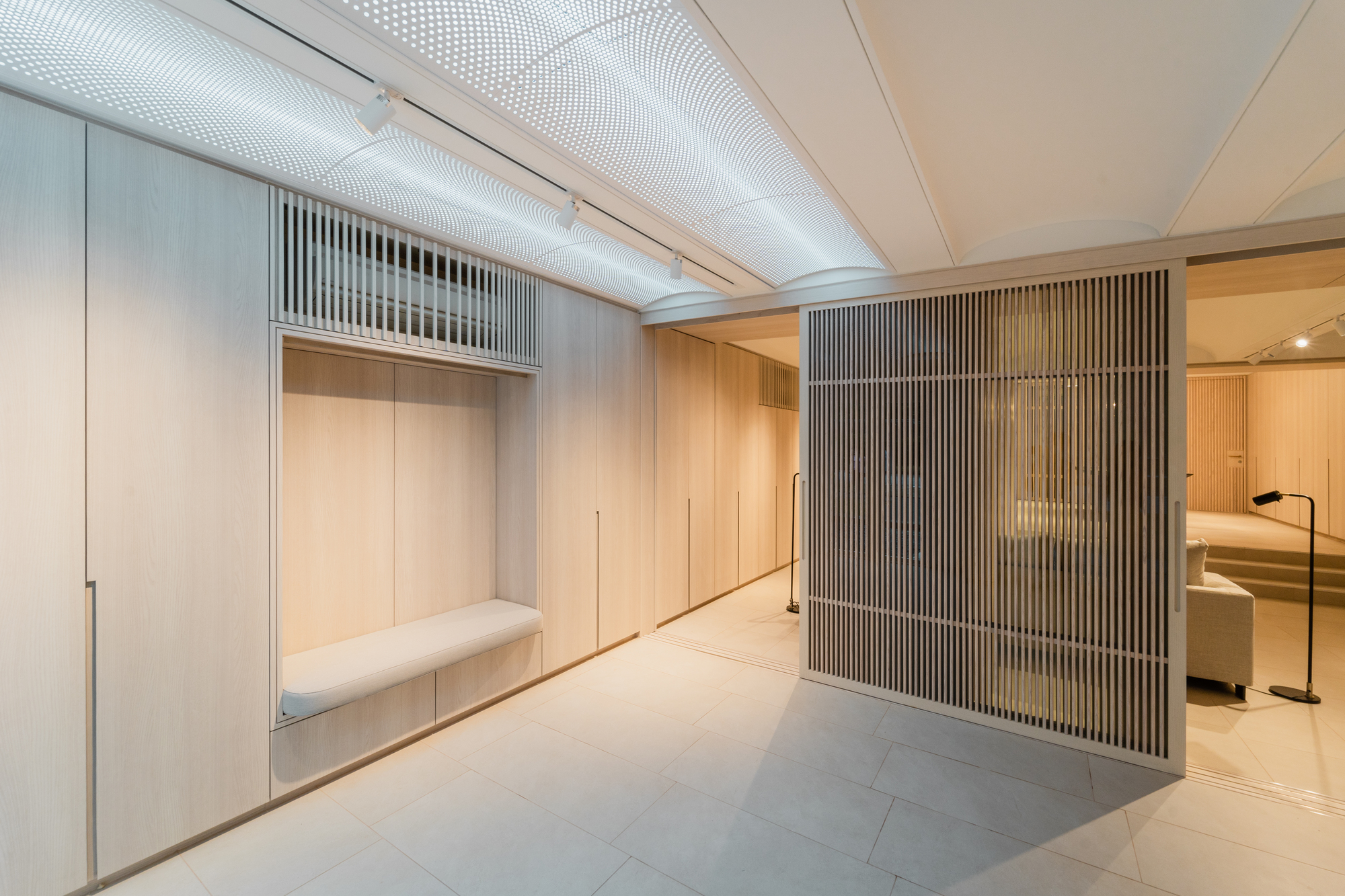 可活動的木製百葉屏幕被廣泛應用於橫截外部至中央的光線與氣流動線,在提供必要隱私遮擋的同時,更具備優異的聲學過濾效果,有效阻絕都會區嘈雜的車水馬龍。柔軟的編織布料濾網進一步調節光影與聲波,孕育出細膩且經過嚴密建構的室內氛圍。