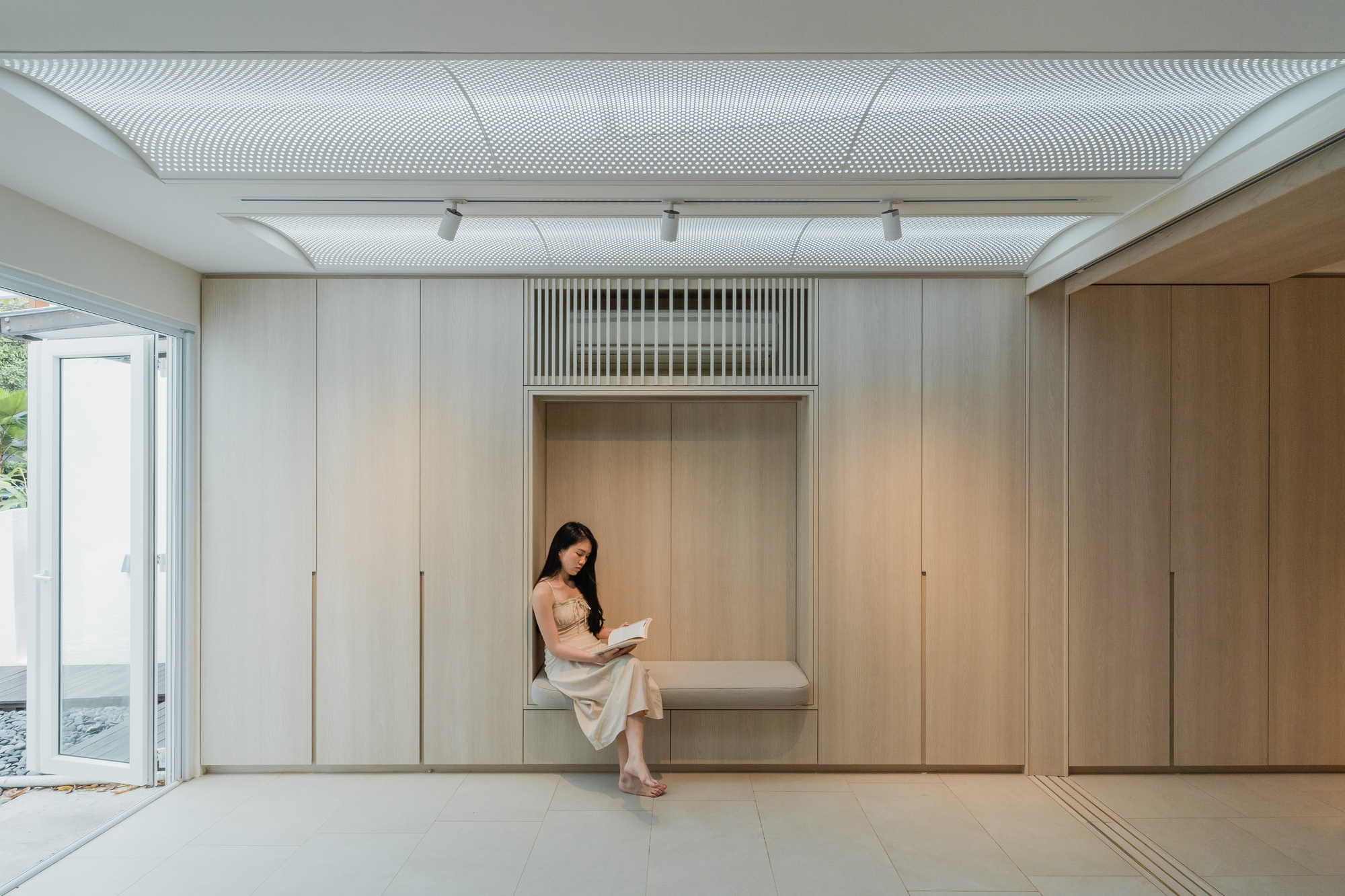 整體堅持極簡的建材色調與一絲不苟的細節要求,結合天花板、屏幕與門扇等純粹的建築語彙,成功讓變幻莫測的氣候躍升為生活場域的絕對主角。居住空間不再只是遮風避雨的硬殼,而是能與自然環境共呼吸的有機生命體,讓人看出設計團隊化繁為簡的深厚功力與關懷居住者身心健康的初衷。