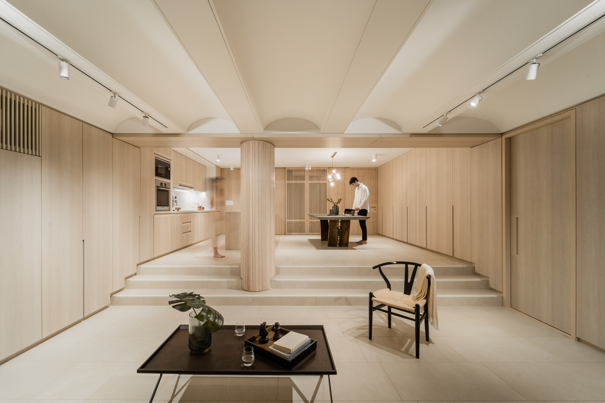 深入公寓後段的第三空間,廚房區域採用高度較低的平坦天花板設計,營造出適合家人親密互動的溫馨尺度,並保留較涼爽的人工溫控環境,供日常家務勞動使用。將視線轉向靠近戶外的前端,天花板造型深受膨脹氣流啟發,轉化為帶有多孔特性的拱頂結構。