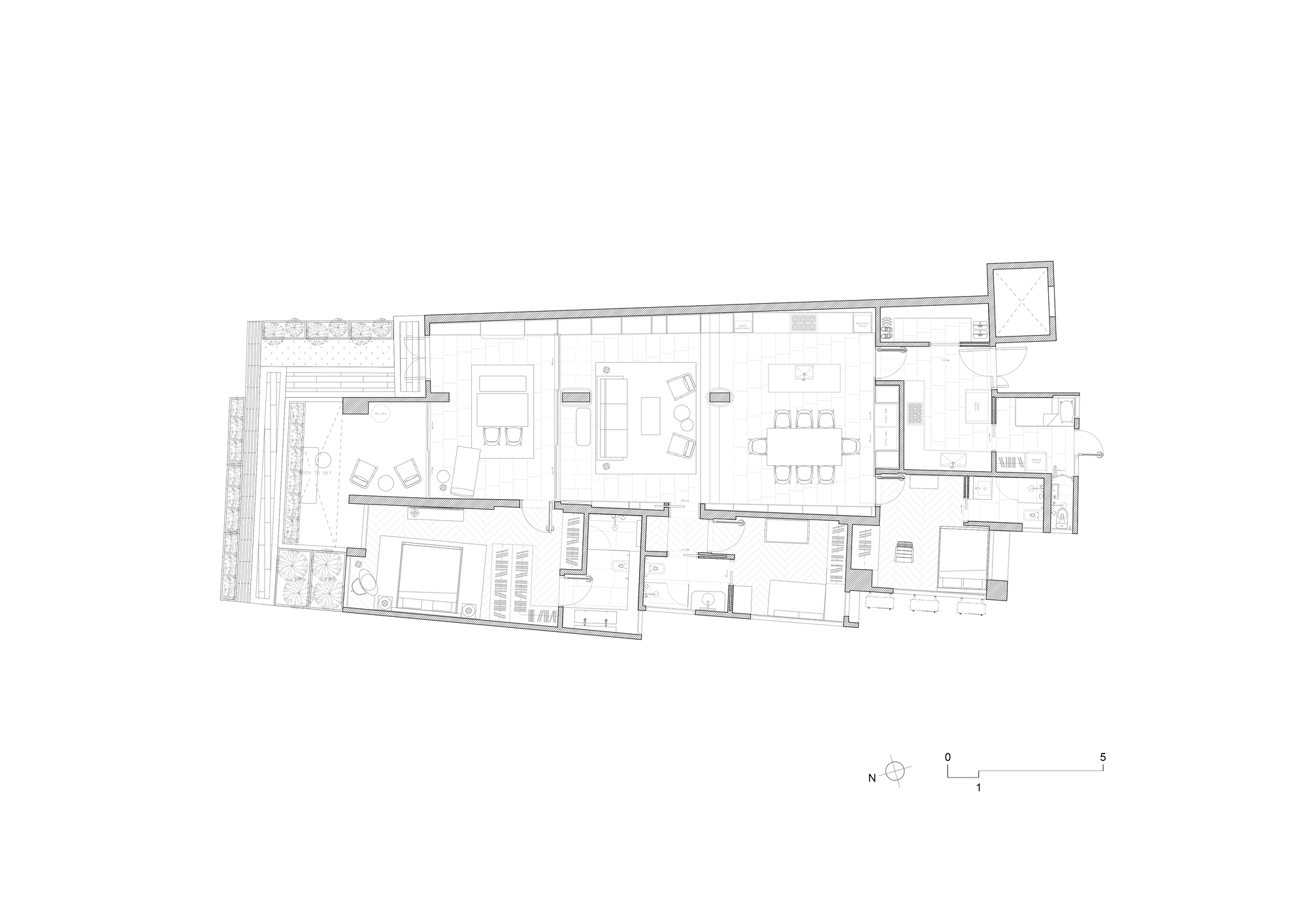 為解決前述痛點,設計團隊在249平方米的輻射狀底層公寓兩端,規劃出雙向開口的通風路徑;一端朝向戶外門廊敞開,另一端則連接公寓大樓內部中庭,引導自然微風橫向穿梭於起居場域。若未來有增建需求,此一平面架構亦能提供良好擴展性。如此規劃徹底顛覆傳統都會住宅封閉格局,讓新鮮空氣成為調節微氣候的天然介質。