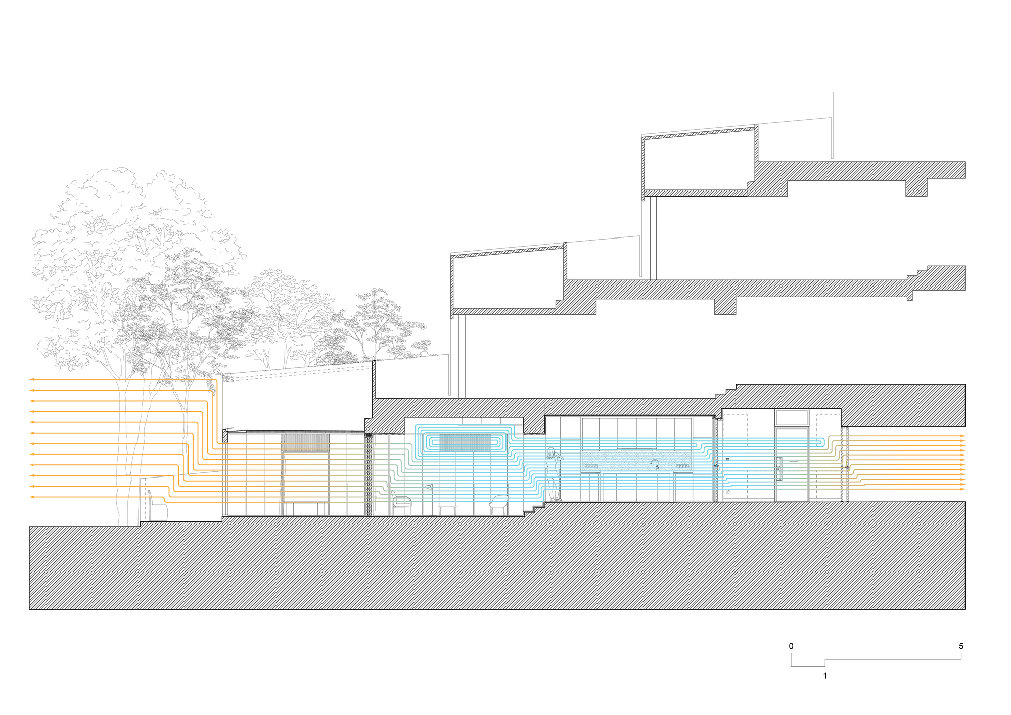 位於中央地帶的第二量體,扮演著承先啟後的關鍵樞紐,負責混合冷氣與未經處理的自然空氣,並調和兩側的光線與視野。為調節三段式空間內的氣候體驗,設計團隊導入多項輔助裝置。