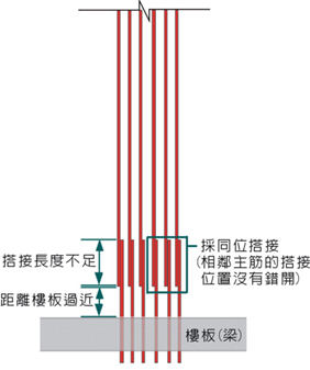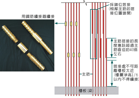 鋼鐵廠生產建築用的鋼筋,會裁切成12~15公尺長,以方便拖板車運送。鋼筋運送到工地之後,須相互搭接,才能讓主筋從基地延續到頂樓。搭接處是鋼筋的不連貫點,也是柱子相對脆弱的地方,容易拉拔斷裂,因此在鋼筋混凝土構造的施工規範中,訂定了詳細的搭接規定,以免柱子耐震能力不足。