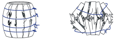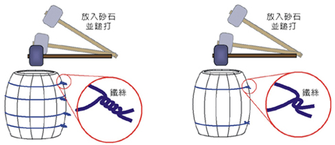 答案揭曉了:左邊的橡木桶,外箍鐵絲間距短,鐵絲末端纏繞緊密,故能耐敲打;右邊的橡木桶,外箍鐵絲間距長,而且鐵絲末端纏繞鬆散,敲打後,鐵絲鬆脫,木桶迸裂,砂石外漏。