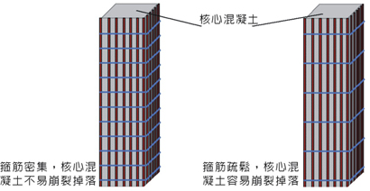 在理論上箍筋的間距越小,核心混凝土的圍束效果越好,但在實務上,過度密集的箍筋會妨礙混凝土澆注時的流動性,反而不切實際。
