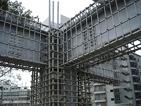 鋼筋混凝土建築的施工方式,是於基礎完成後,組立柱子的鋼筋,並在鋼筋外圍架設模板,再澆注混凝土;待柱子的混凝土凝固達到一定強度後,再組立梁和樓板的鋼筋,並架設模板灌注混凝土,之後逐層往上興建。