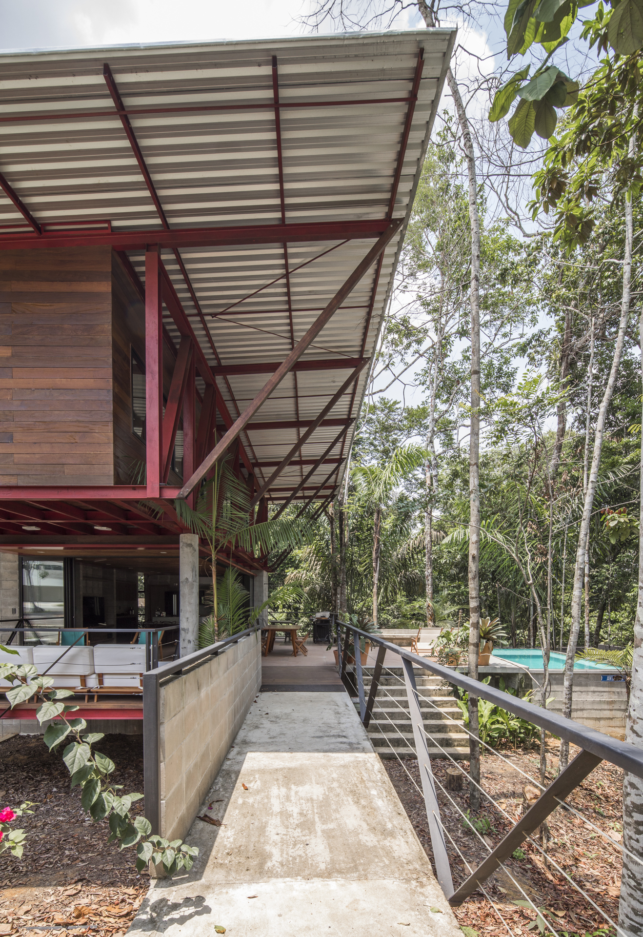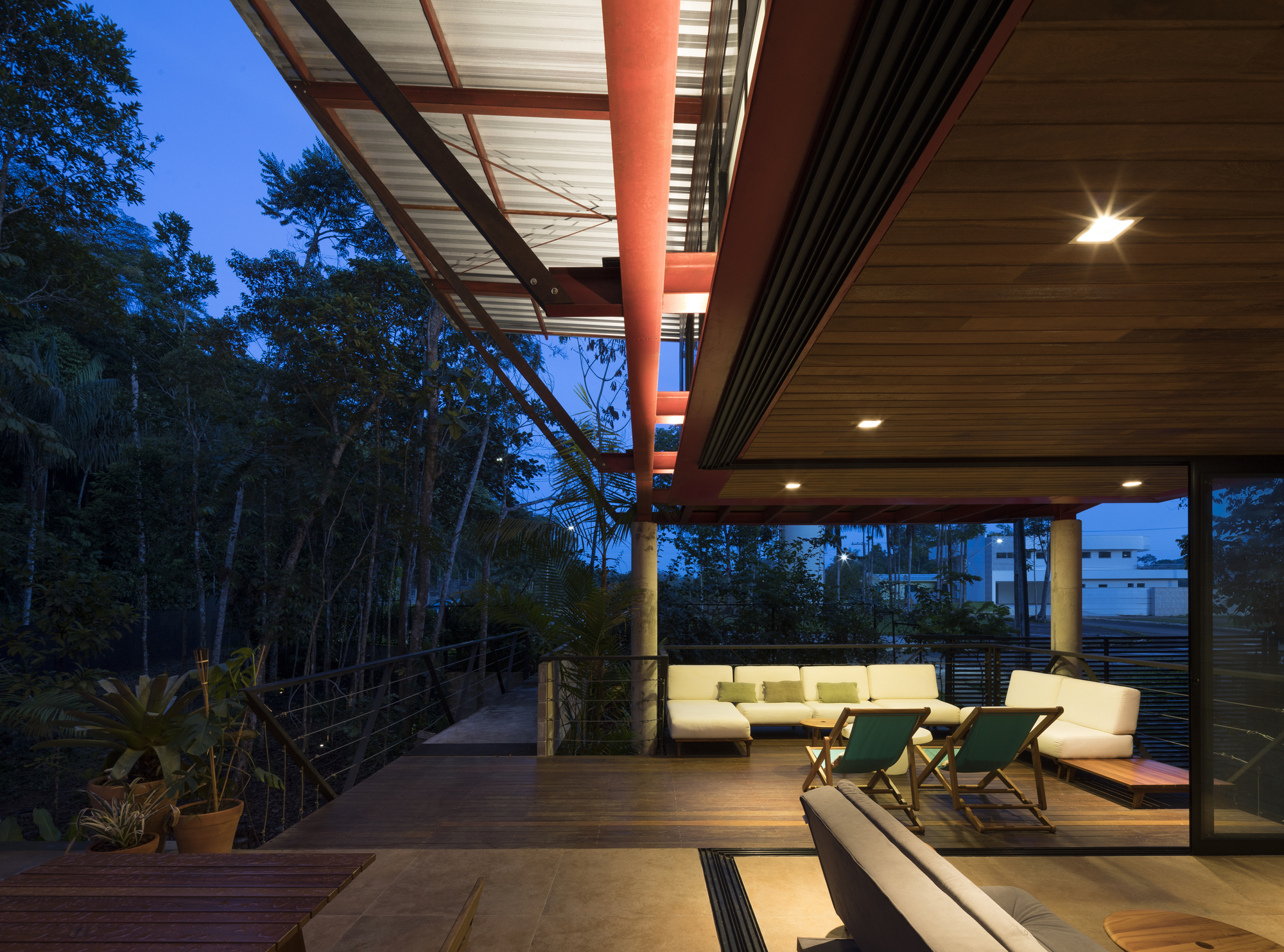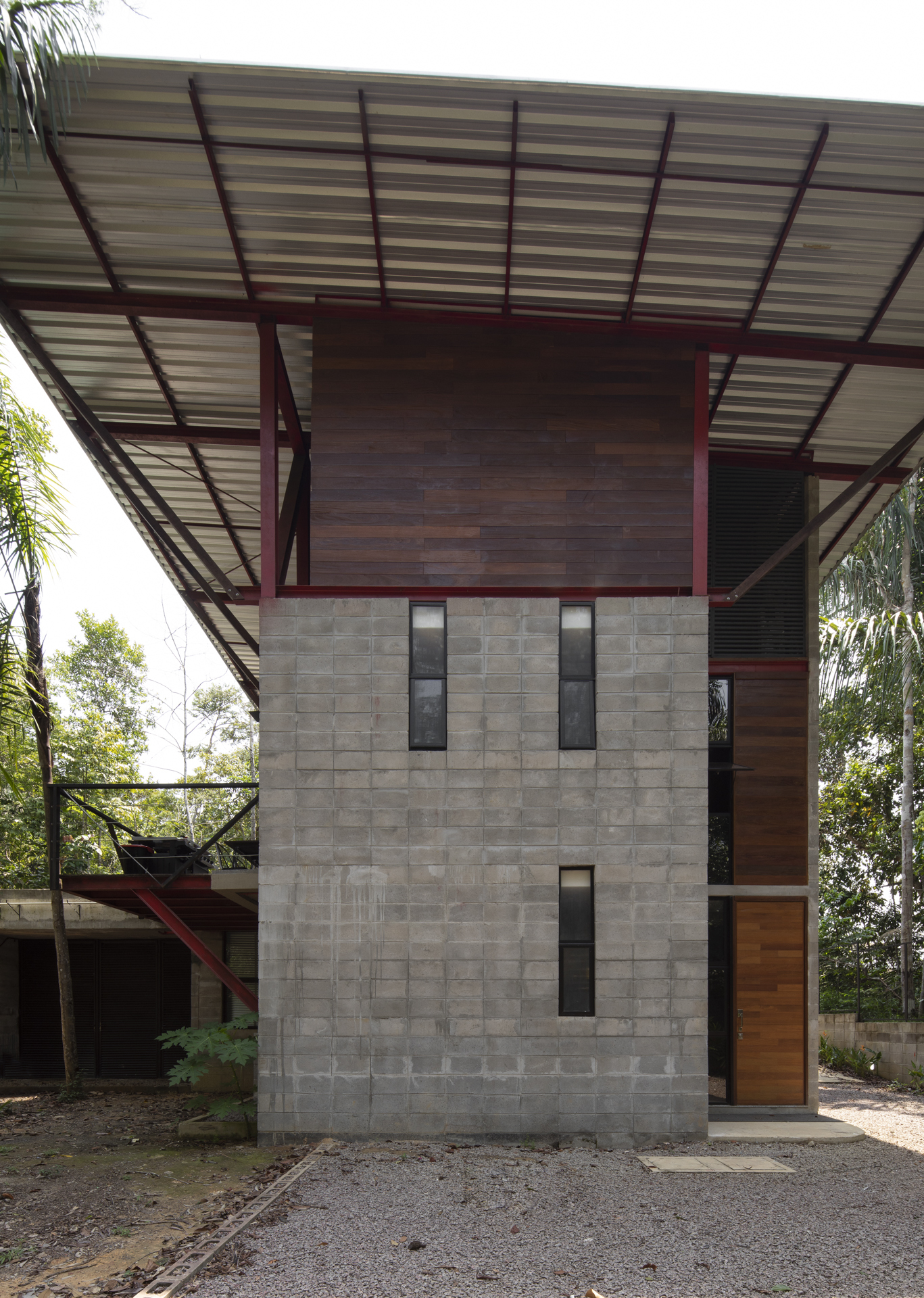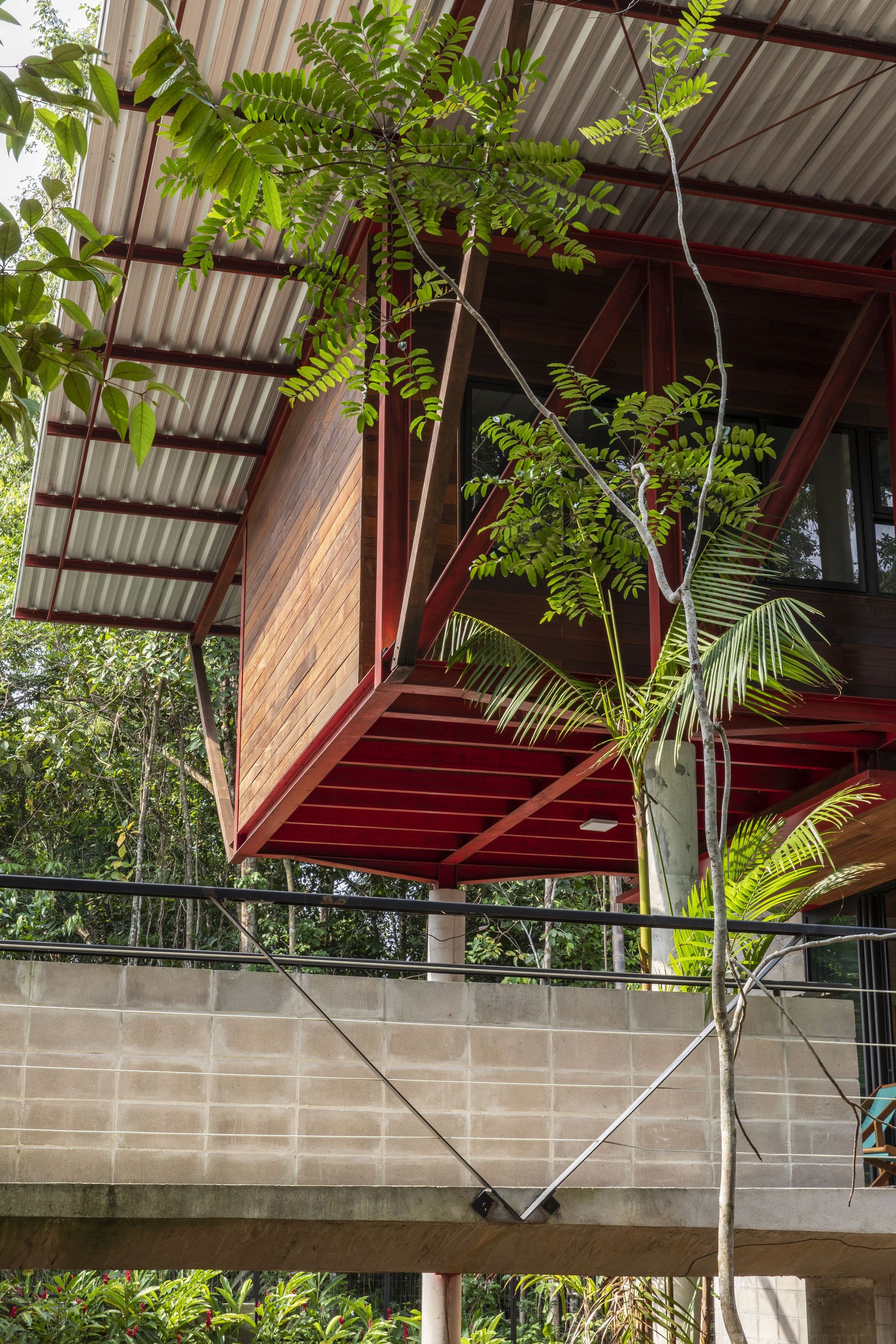這座住宅是鋼材、木材與混凝土三種材料的交響樂章。懸浮量體的外牆、私密區域的地板,以及休閒區域的甲板與天花板,皆大量運用了溫潤的木材,與冷冽的鋼構骨架形成強烈對比。大型屋頂採用具備隔熱功能的三明治板,深屋簷有效地阻擋了亞馬遜地區的暴雨與烈日。
