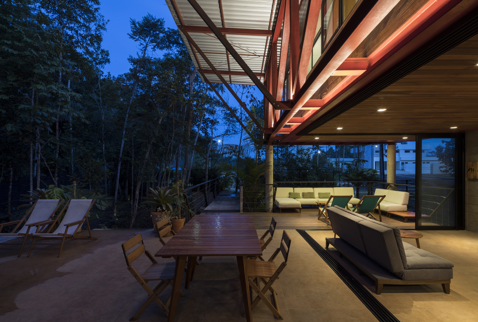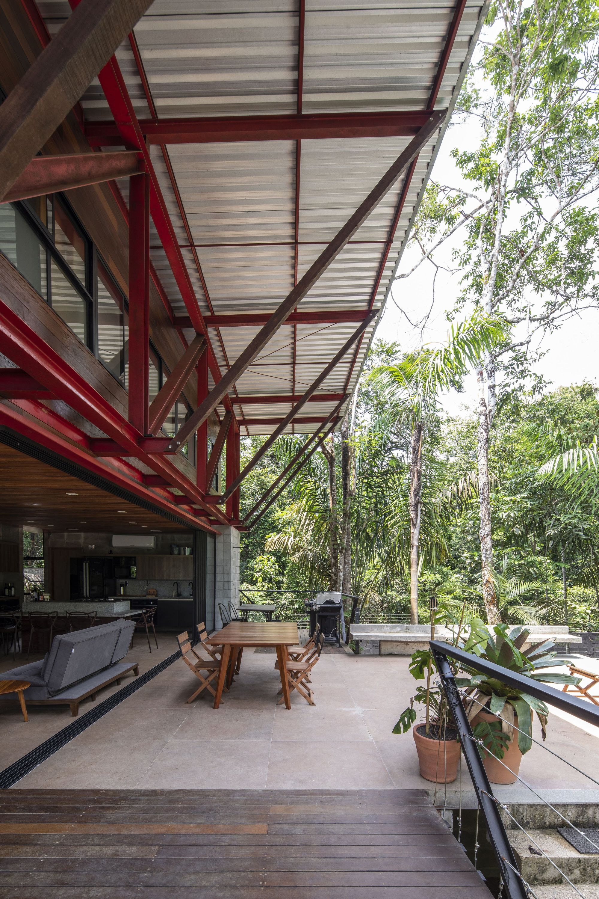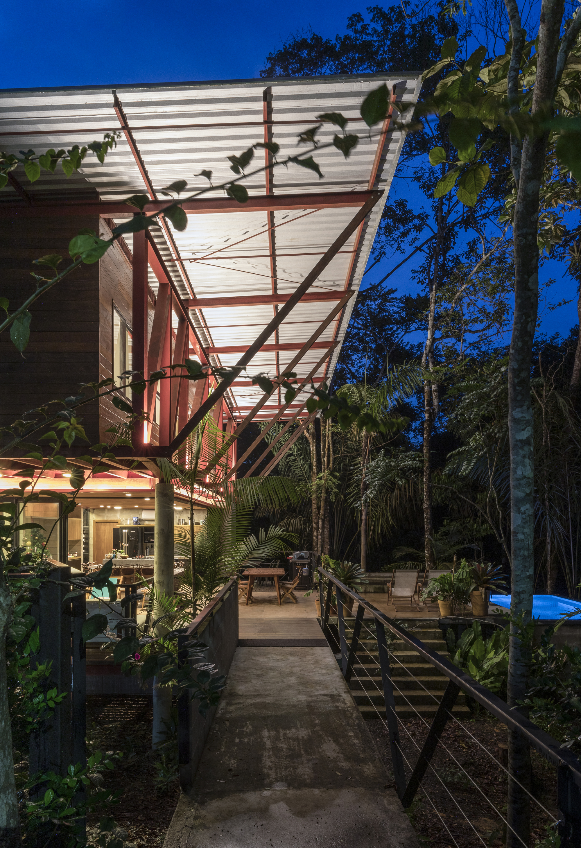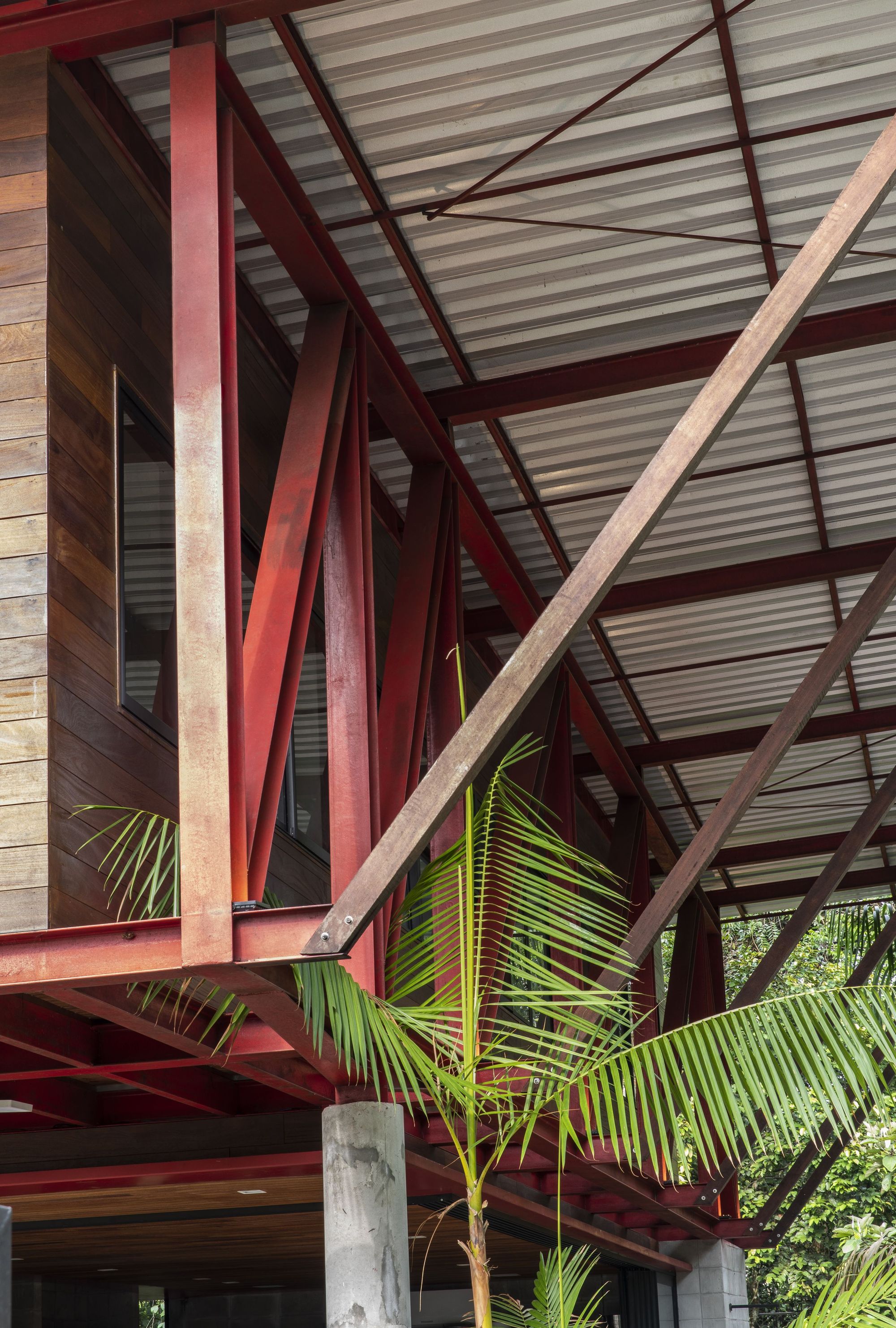 這座住宅是鋼材、木材與混凝土三種材料的交響樂章。懸浮量體的外牆、私密區域的地板,以及休閒區域的甲板與天花板,皆大量運用了溫潤的木材,與冷冽的鋼構骨架形成強烈對比。大型屋頂採用具備隔熱功能的三明治板,深屋簷有效地阻擋了亞馬遜地區的暴雨與烈日。