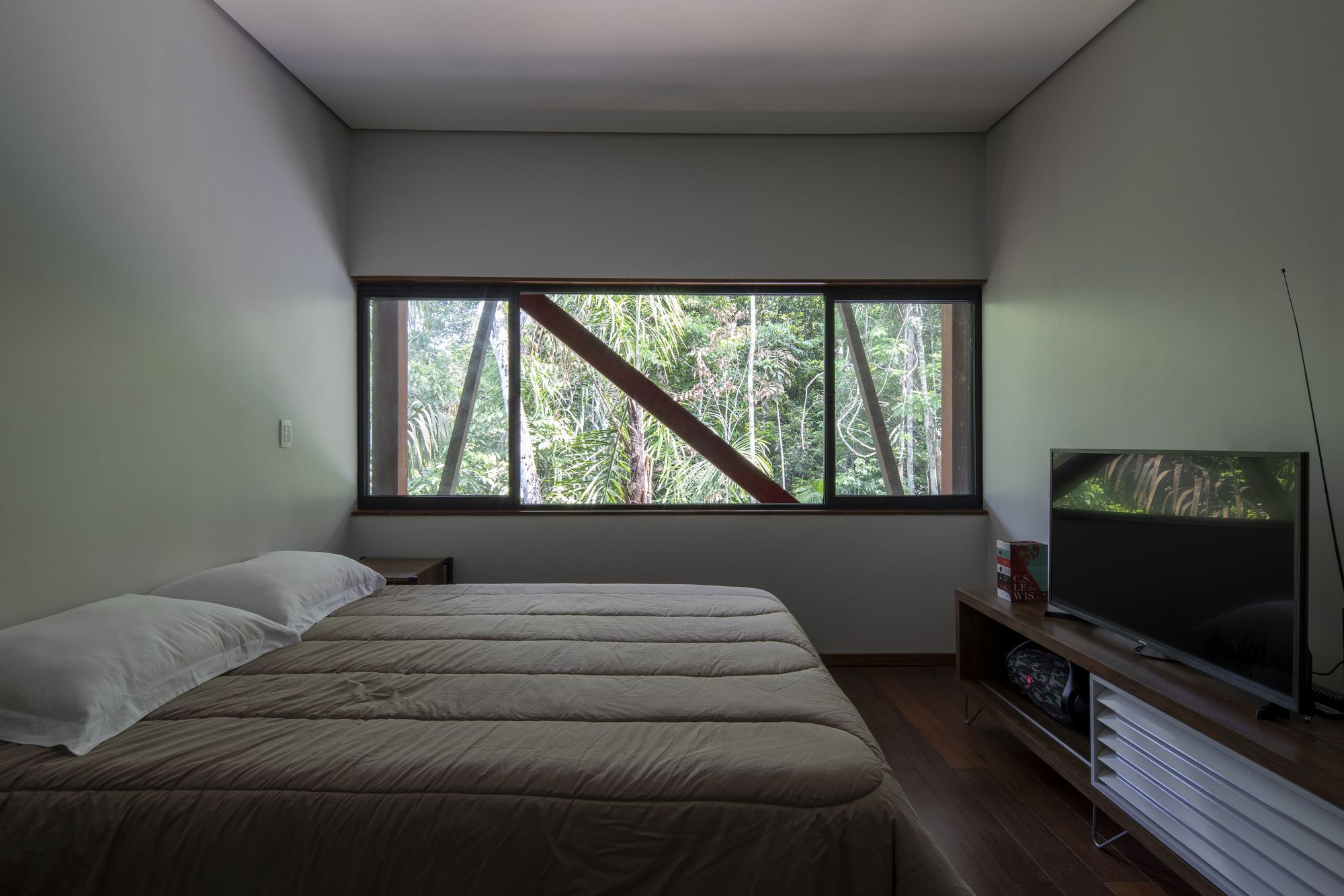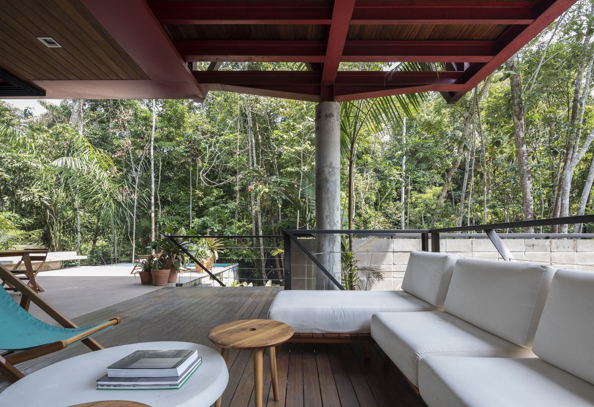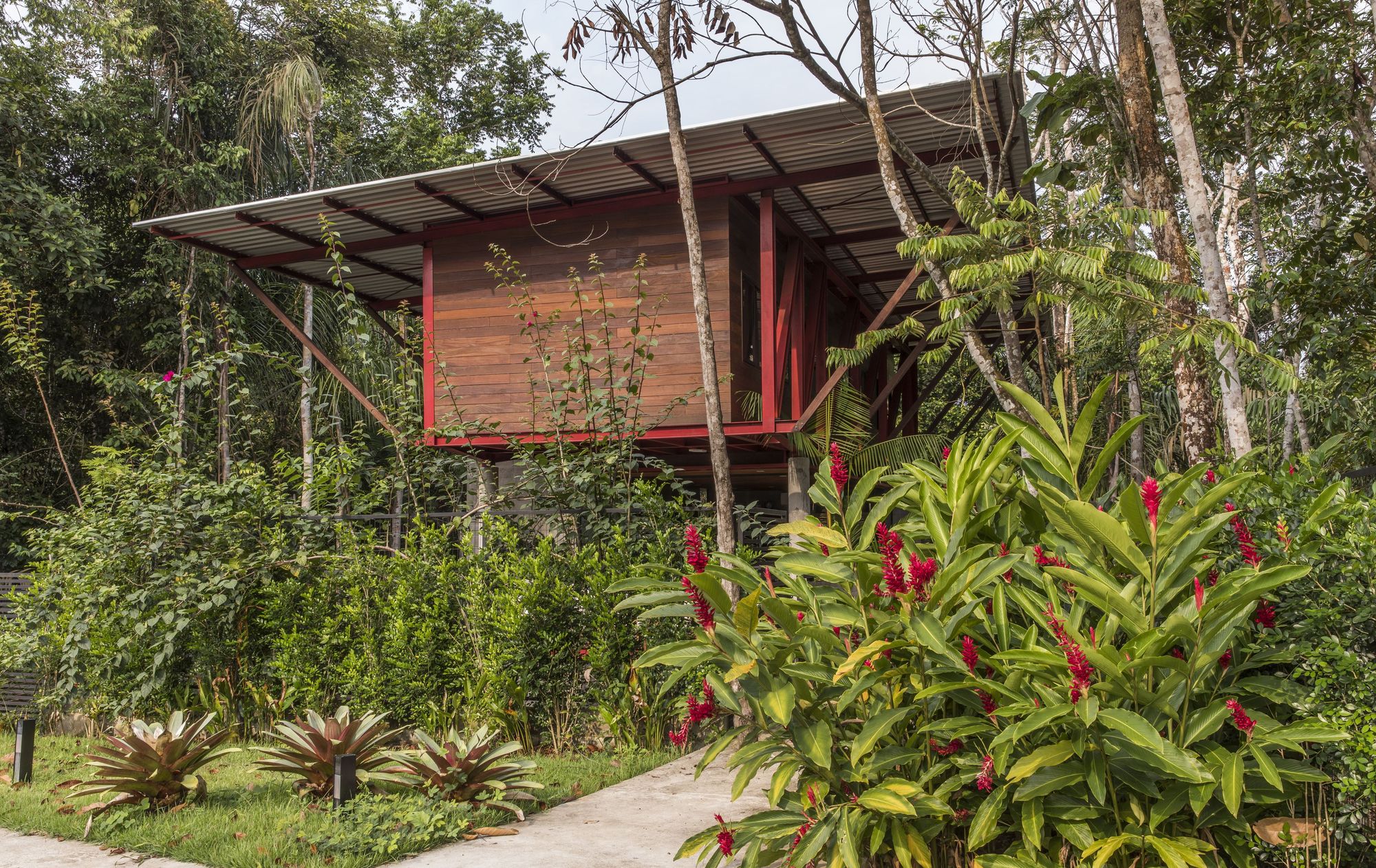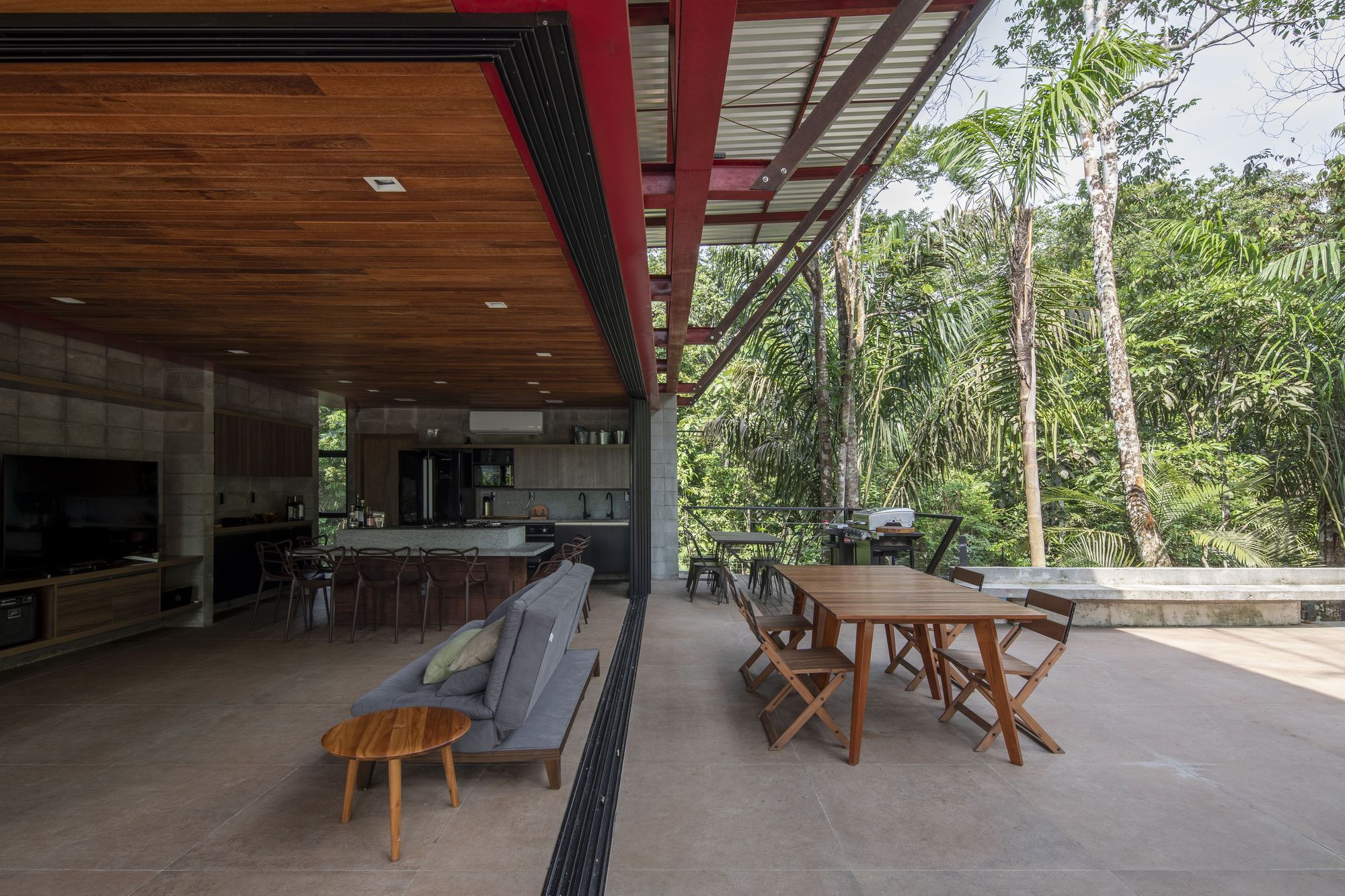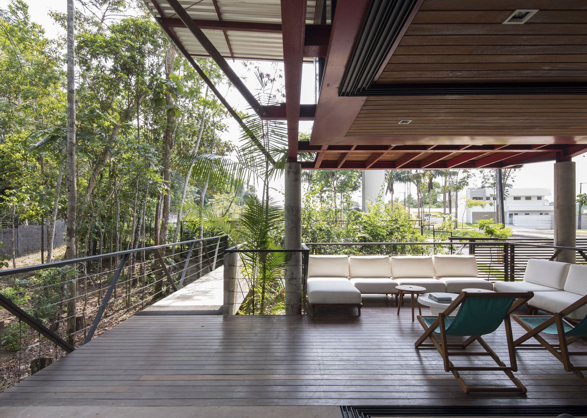 這座住宅是鋼材、木材與混凝土三種材料的交響樂章。懸浮量體的外牆、私密區域的地板,以及休閒區域的甲板與天花板,皆大量運用了溫潤的木材,與冷冽的鋼構骨架形成強烈對比。大型屋頂採用具備隔熱功能的三明治板,深屋簷有效地阻擋了亞馬遜地區的暴雨與烈日。
