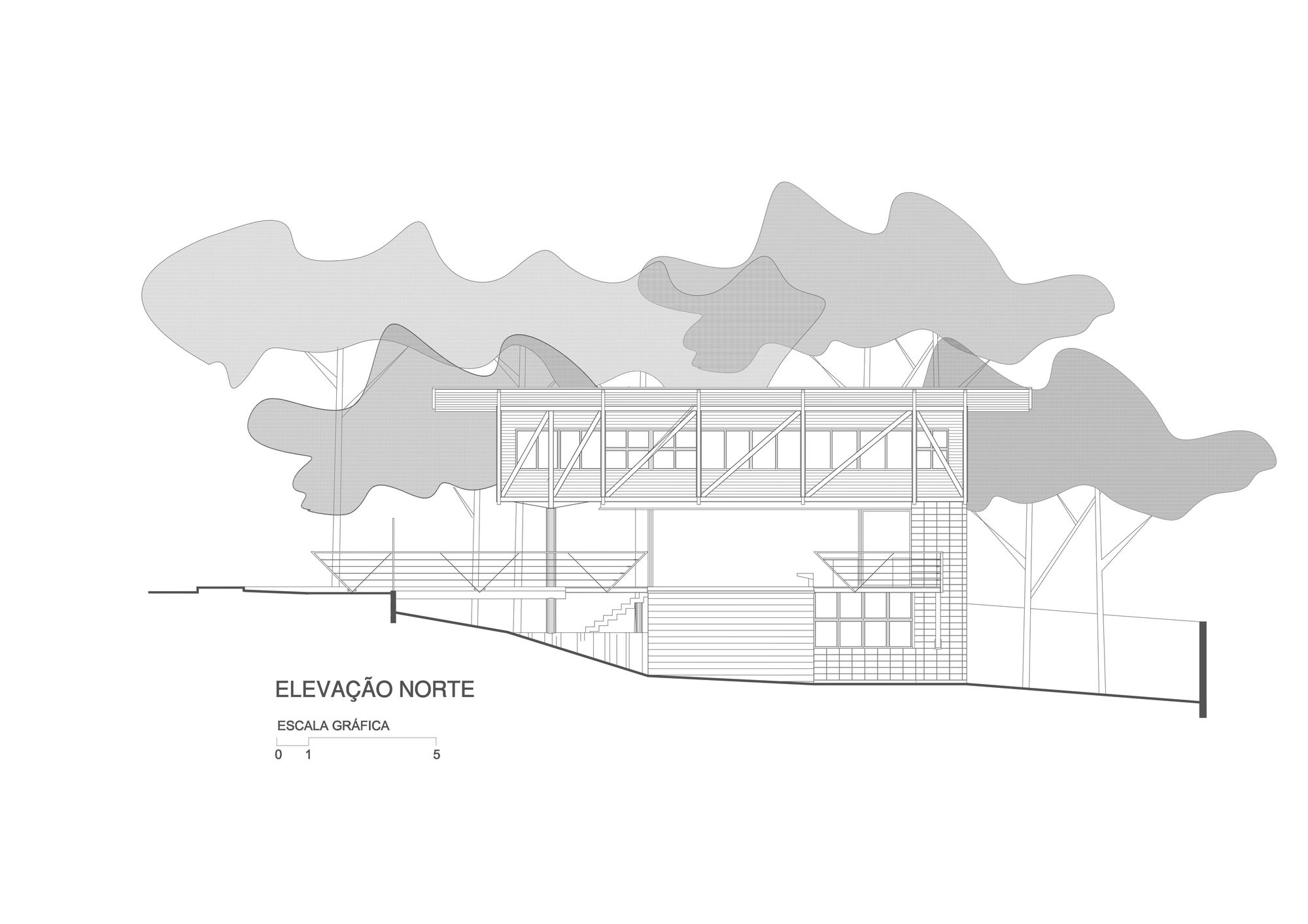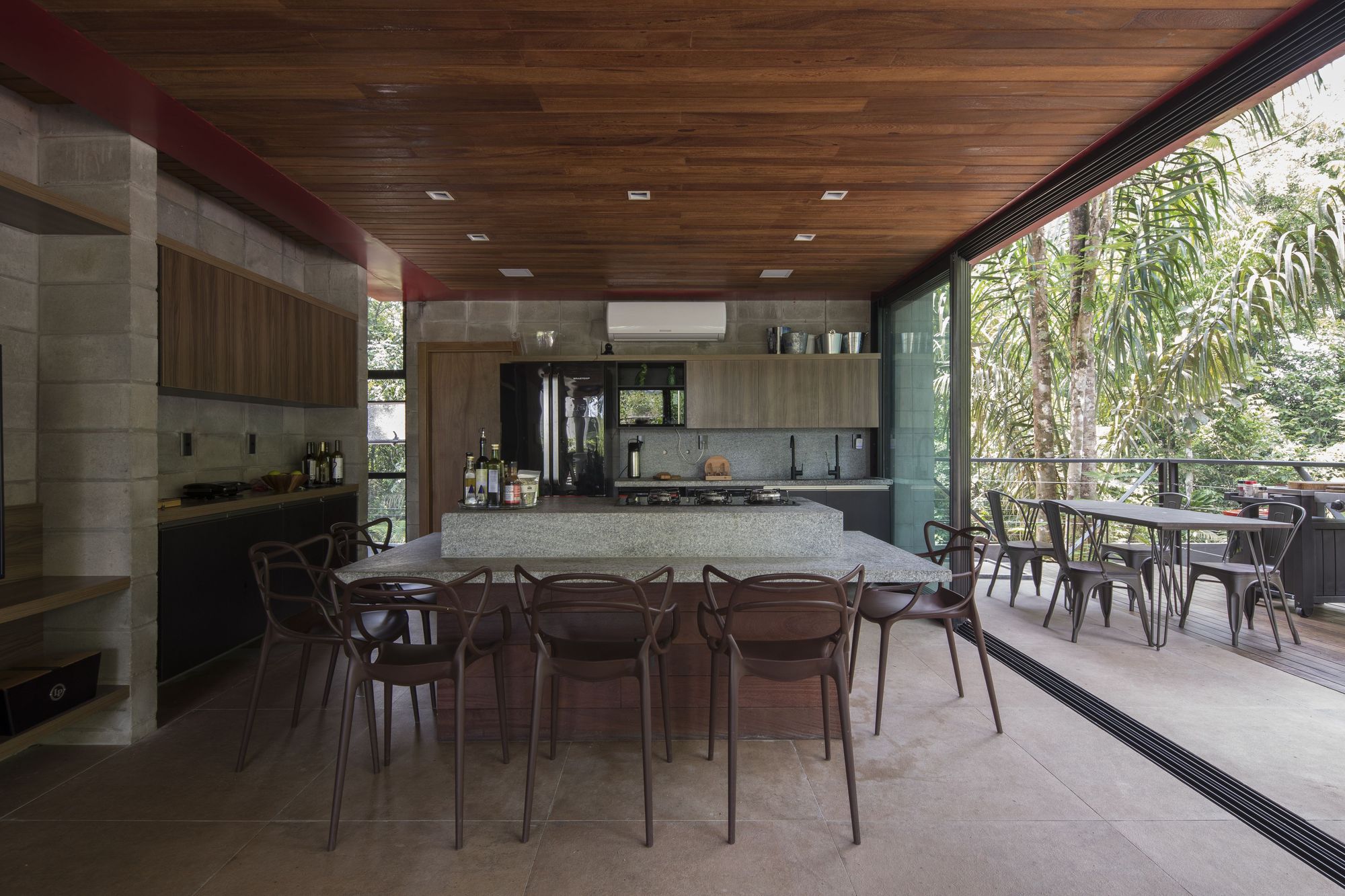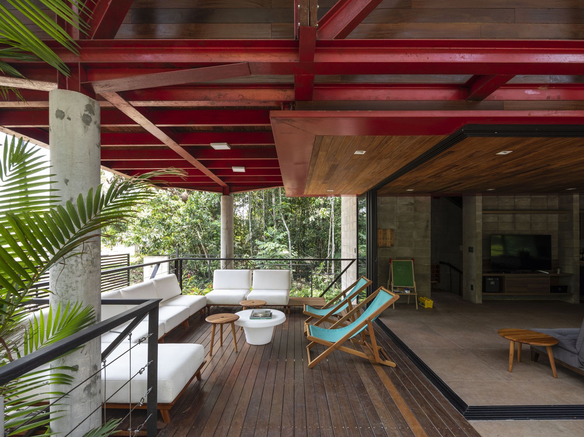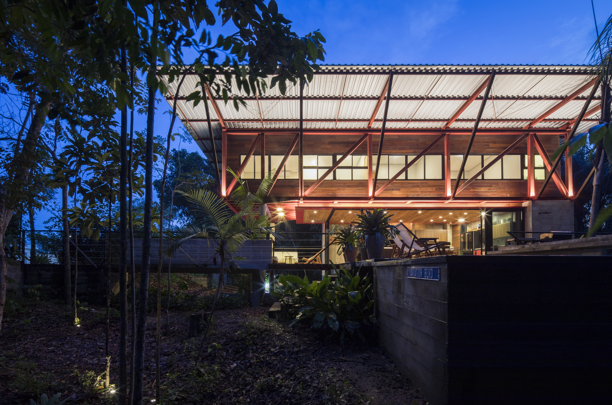 這座住宅是鋼材、木材與混凝土三種材料的交響樂章。懸浮量體的外牆、私密區域的地板,以及休閒區域的甲板與天花板,皆大量運用了溫潤的木材,與冷冽的鋼構骨架形成強烈對比。大型屋頂採用具備隔熱功能的三明治板,深屋簷有效地阻擋了亞馬遜地區的暴雨與烈日。
