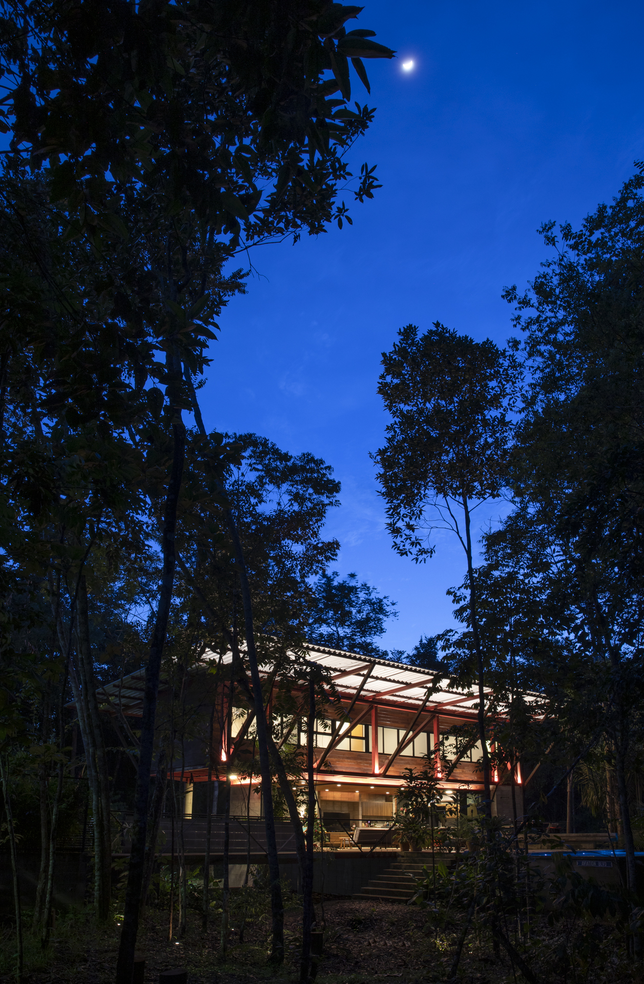 在景觀處理上,建築師採取了「無為而治」的智慧。森林地表的落葉不再被視為需要清理的垃圾,而是被保留下來作為低維護的透水性地被(Permeable ground cover)。這些落葉在腐爛分解的過程中,轉化為滋養樹木的天然肥料,形成了一個微型的生態循環系統。這種設計策略不僅降低了後續的維護成本,更強化了建築與土地之間的有機連結。Truss House 的存在,並未切斷自然的脈動,反而透過建築的介入,讓這片土地的生態價值被重新看見與珍視,為熱帶地區的永續住宅提供了一個極具啟發性的範本。