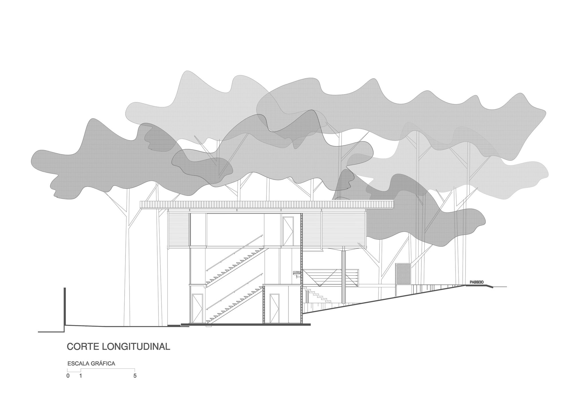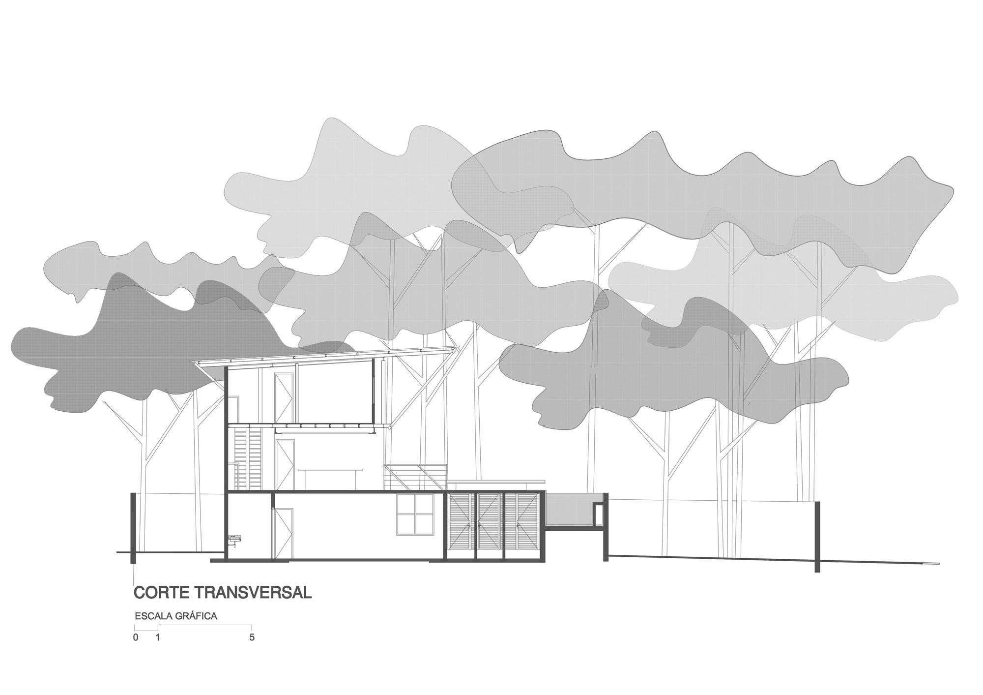 基地本身是一塊帶有沙質土壤的緩坡地,樹木林立。設計團隊順應這股地勢,將建築機能垂直劃分為三個層次:與街道齊平的休閒層、上層的私密居住區,以及下層的客房空間。這種剖面配置不僅減少了土方開挖,更創造了豐富的空間體驗。