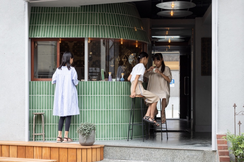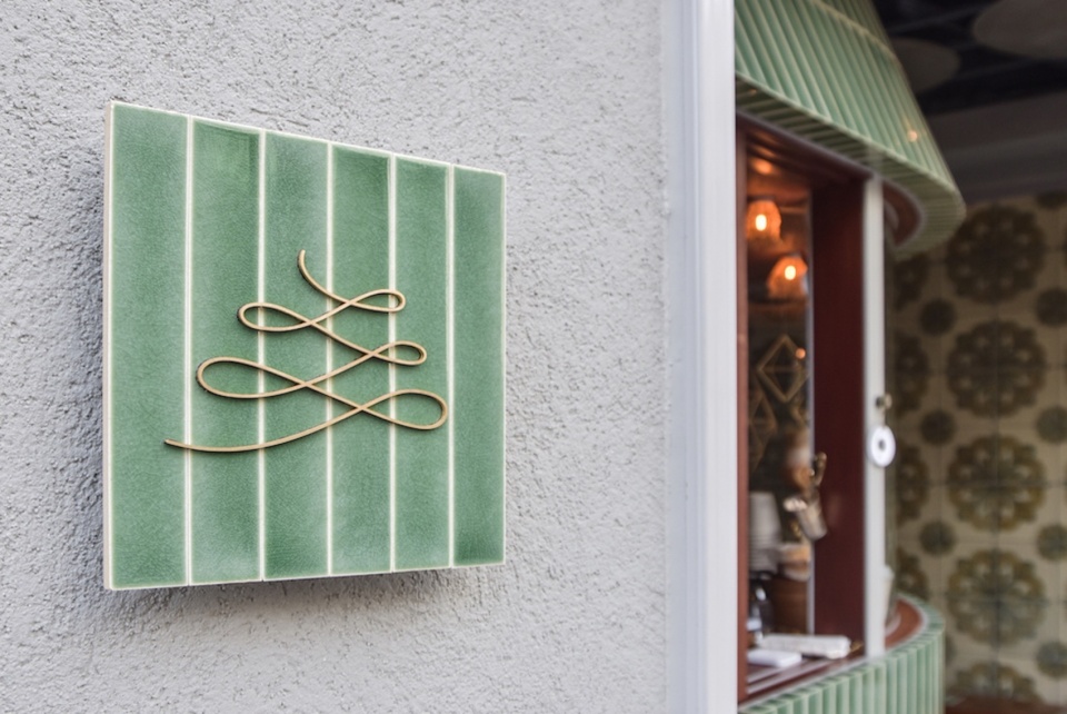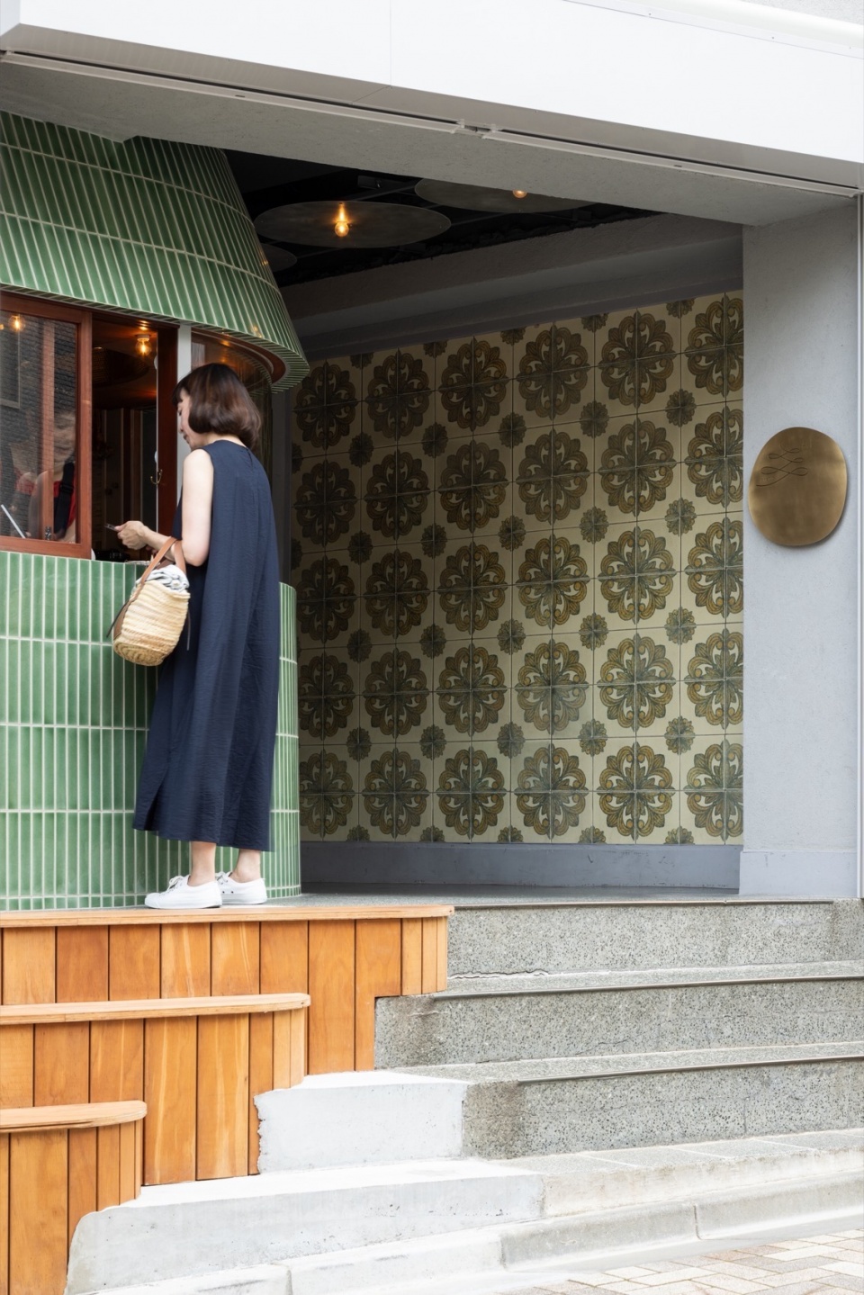 店舖所用的綠色外牆瓷磚是設計團隊專為這次室內設計案所特別製作的,釉色經過專屬調製。設計團隊用心挑選了一種色彩,與既有建築外牆上那引人注目的黃色歷史瓷磚相互映襯,希望創造出兩者間互相尊重的平衡感。