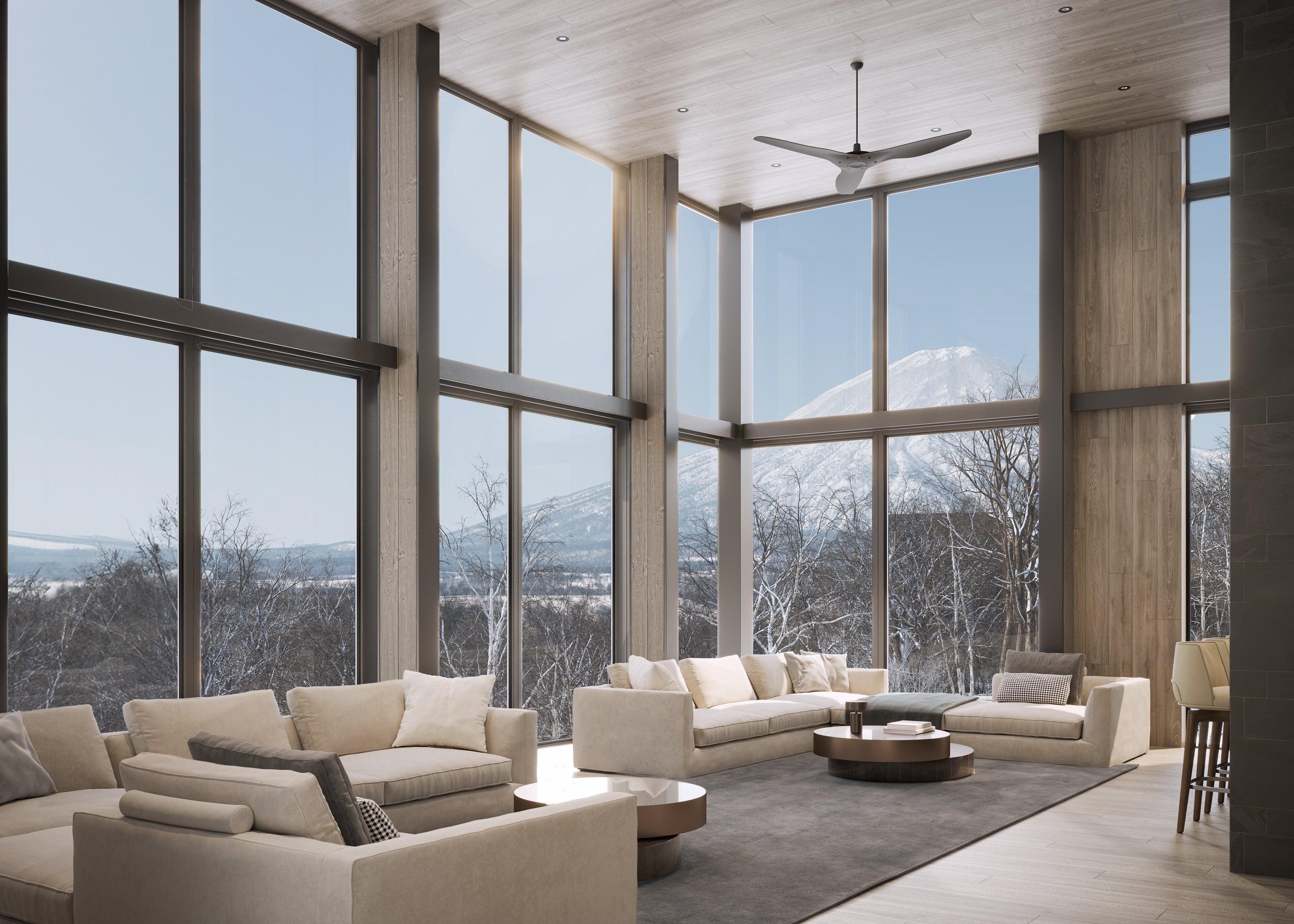 客廳天花板高度約5米,三面玻璃窗設計讓空間充滿開闊感,窗外的羊蹄山宛如一幅壯麗的畫作。