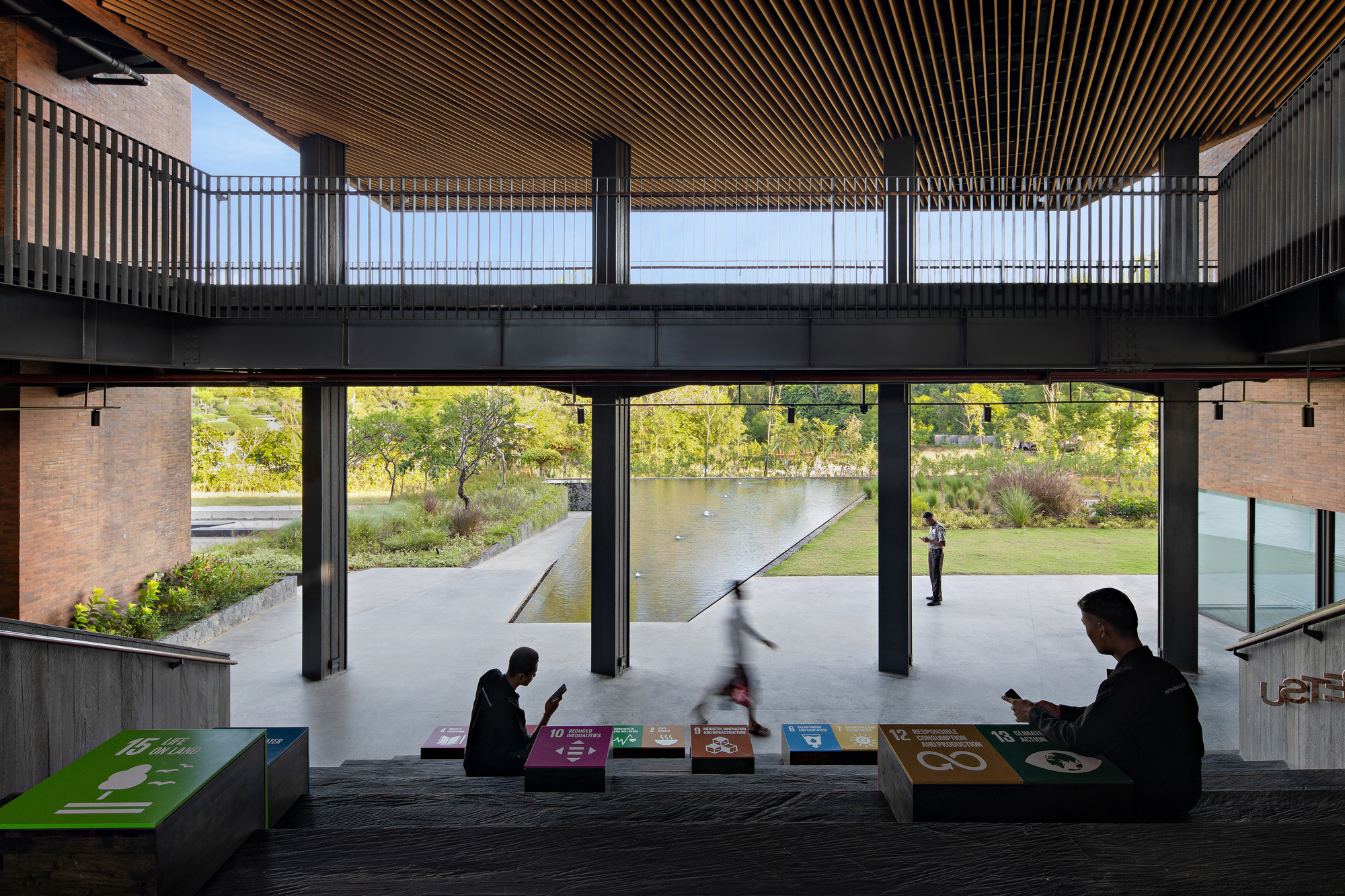呼應校園名稱「United-in-Diversity」(多樣性中的團結),建築內部的機能被拆解並分裝在一個個獨立的紅磚量體(Brick volumes)之中。這些量體並非直接落地,而是被鋼構柱列高高舉起,向上延伸至屋頂結構,彷彿懸浮在空中的盒子。這種設計手法創造了大量的公共開放空間,讓風與光線能夠在實體單元之間自由穿梭。紅磚這種在當地隨處可見的材料,賦予了建築溫暖的質感與歷史的厚度,而現代化的鋼結構則提供了輕盈的支撐。這種虛實交錯的佈局,讓建築物變成了一個可呼吸的有機體,模糊了室內與室外的界線,讓使用者在移動過程中,能時刻感受到峇里島特有的微風與濕潤空氣,體驗到與自然共生的生活方式。