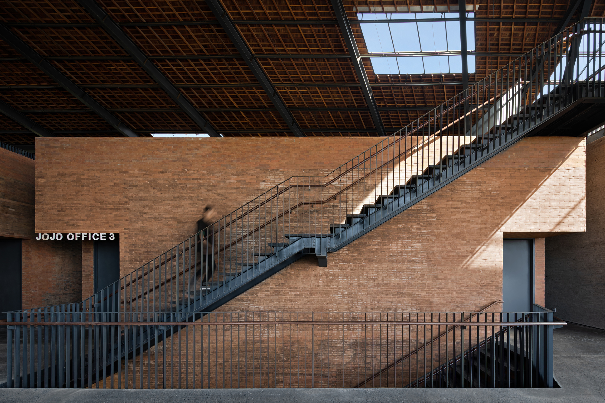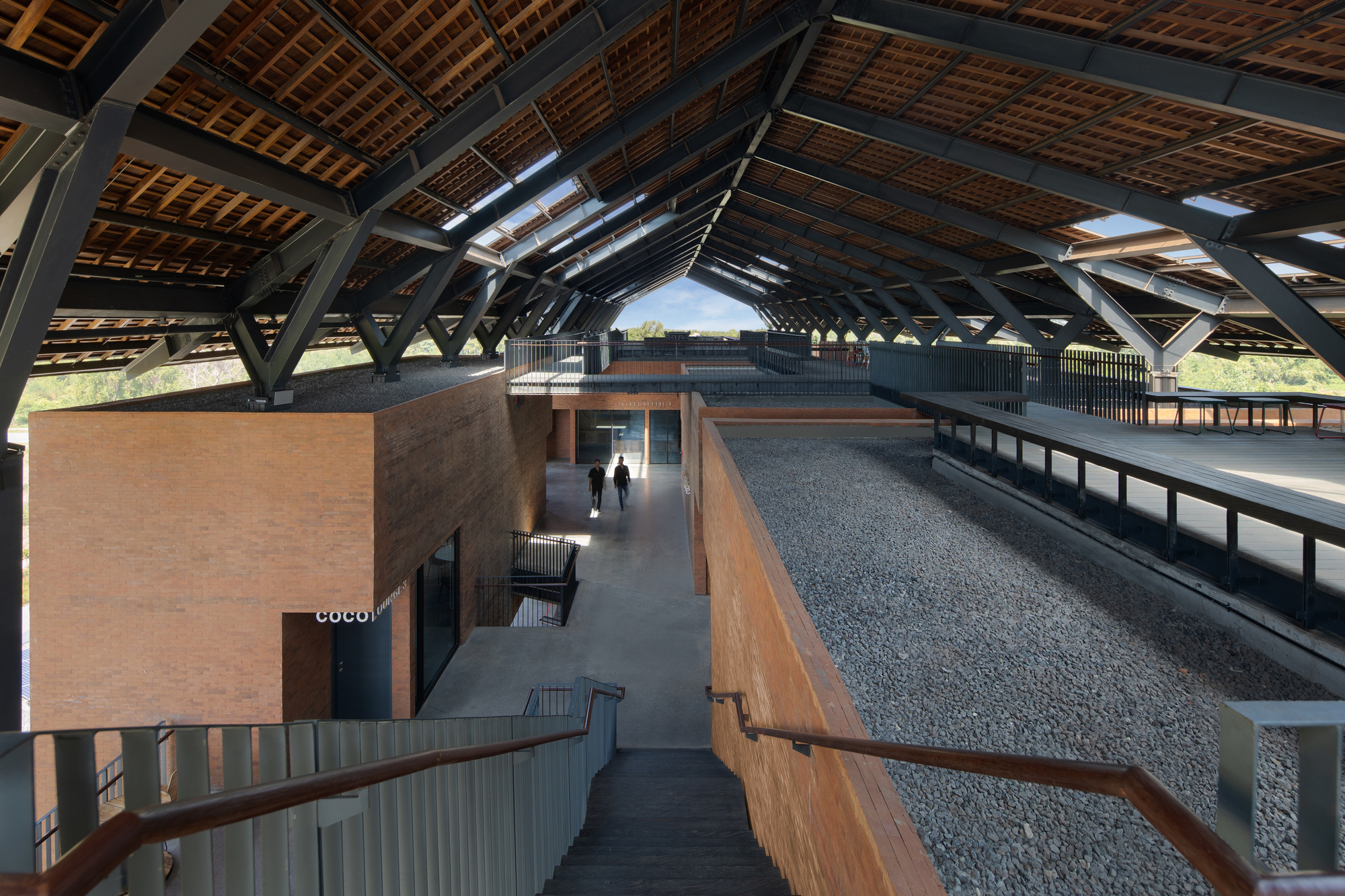 封閉的紅磚量體與開放的內部空間在同一個大屋頂下相互對話,創造出獨特的空間體驗。使用者在其中穿梭,視覺與聽覺的連結產生了動態的化學反應,如同一個垂直發展的立體聚落,充滿了生活的無限可能。