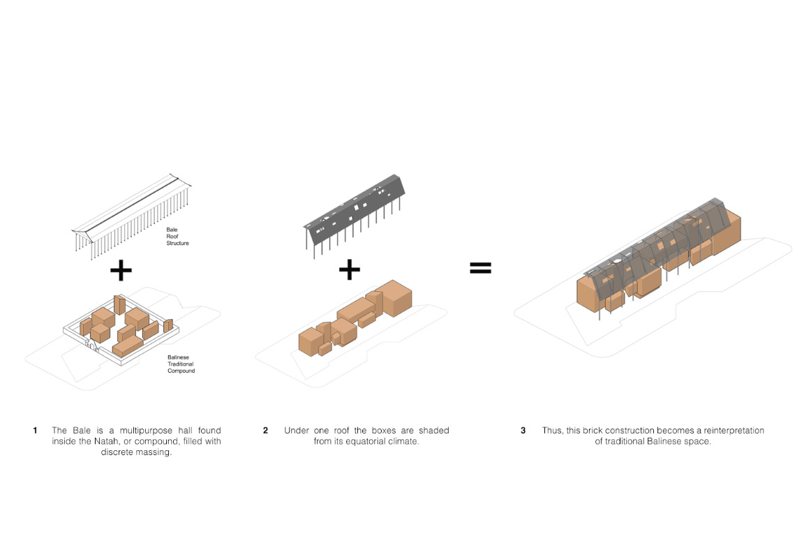 設計概念汲取自峇里島常見的鄉土建築——「Bale」。這種傳統的茅草屋頂涼亭,自古以來便是村民聚會、休憩或舉行儀式的多功能場所,象徵著社群的凝聚。Bale 的屋頂形式不僅是遮風避雨的構造,更具有象徵意義,向上指向山脈與天空。
