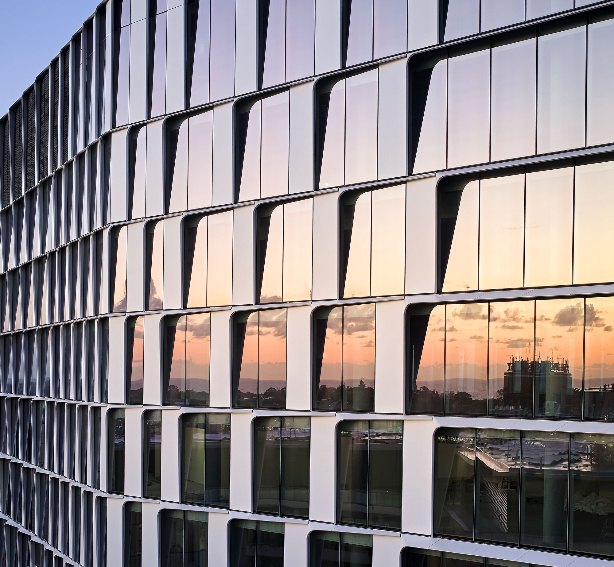 高達14層樓的立體量體,外觀呈現出充滿流線韻味的雕塑美學,呼應其匯聚人群與跨學科思想的樞紐定位。立面設計靈感源自雪梨東部海岸線受海風吹拂形塑而成的自然沙丘,呈現當地風土的當代藝術詮釋。澳洲夏季日照極為強烈,外牆系統為此整合凸出遮陽罩、雙層玻璃與隔熱板,在有效控制太陽熱能侵入室內的同時,也虛化龐大建築的笨重感。