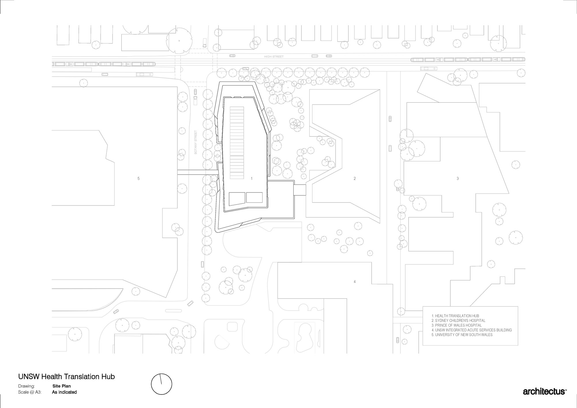 基地精準座落於 High Street 與 Botany Street 的黃金交叉口,建築量體在實體與象徵層面上,皆精準縫合大學校區與相鄰的醫院廣大腹地。設計團隊特別將1樓地面層規劃為具備極高滲透性的開放式市民廣場,將都市的公共人流自然引入基地內部,並提供直達周邊交通路網與重要醫療節點的便捷穿越通道。