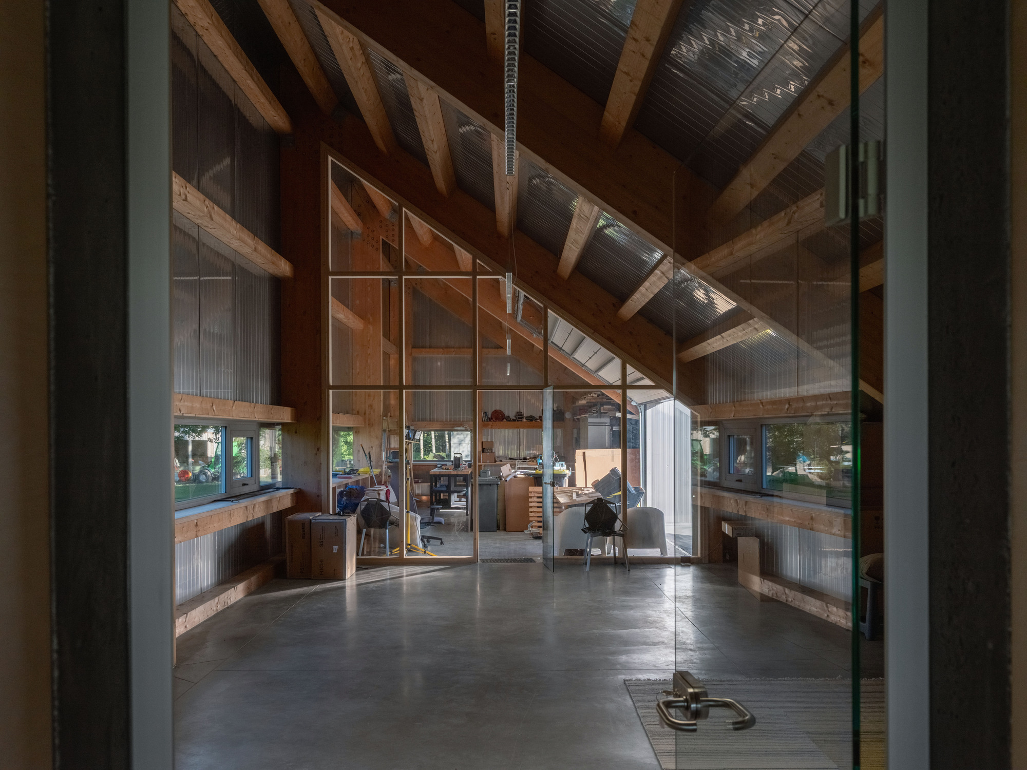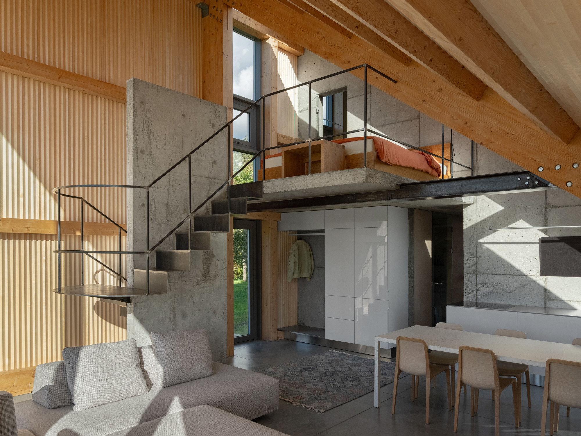然而,建築的西側則展現了完全不同的人性化尺度。這裡設有獨立入口,通往一系列超越傳統倉庫概念的空間。透過精心設計的輔助房間與夾層樓板,創造出一個真正的通用空間。得益於高品質的工程解決方案與充足的自然光線,這個區域可以瞬間轉換功能:白天是充滿活力的工作坊或辦公室,夜晚則變身為設備齊全的客房,提供客人飽覽自然美景的住宿體驗。