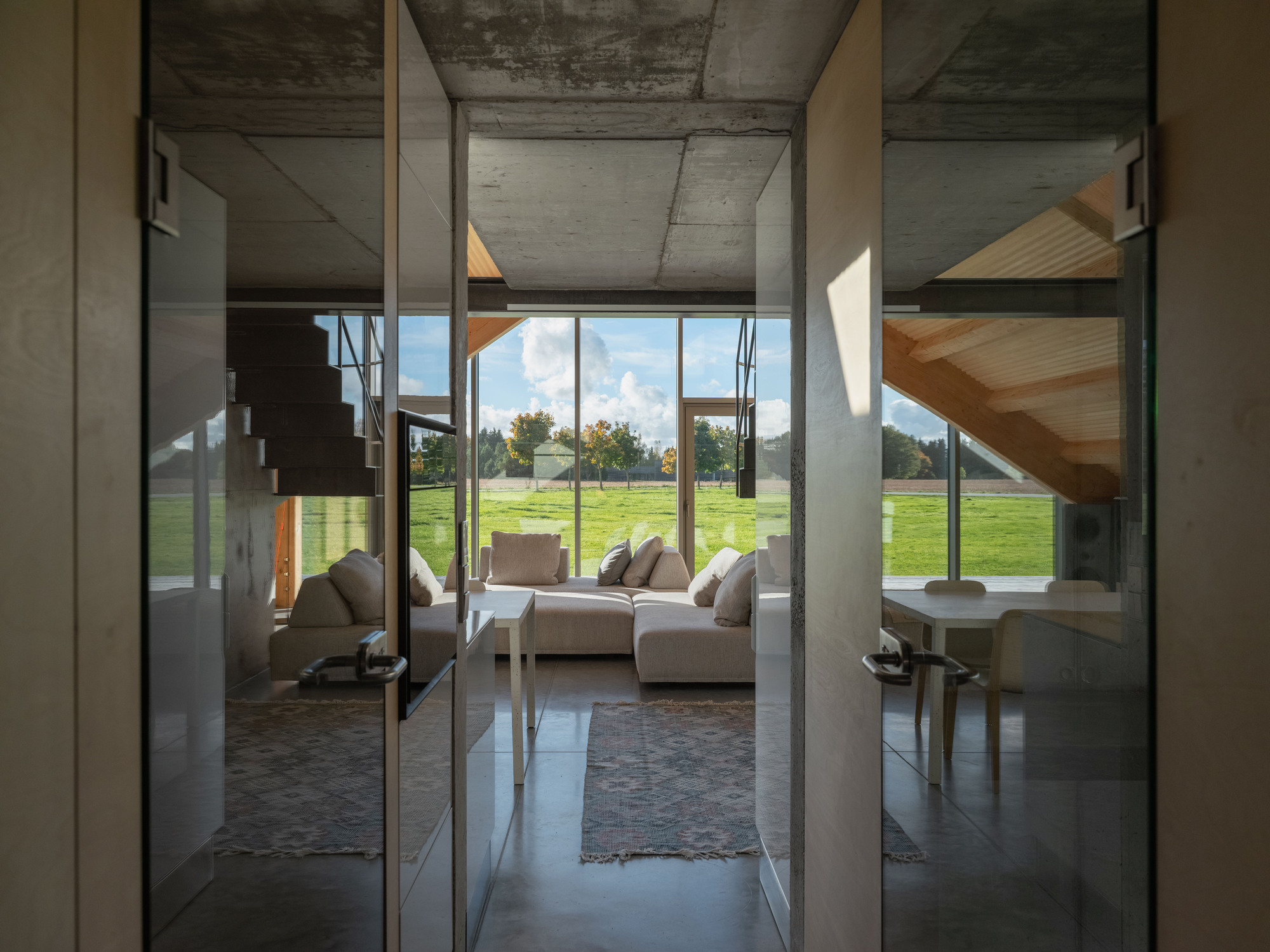 為了營造出農用建築中罕見的溫馨感,建築團隊(由專案負責人T. Jūras與建築師K. Lodaitė領軍)刻意避開了廉價的裝修方案。室內性格由外露的 GLT 膠合木構(GL28h等級)所形塑。巨大的木構架為空間增添了韻律感與溫暖度,柔化了拋光混凝土地板帶來的工業冷冽感。這種材料的二重奏創造出一種類似Loft的美學風格——既耐用到足以應對粗重的農務工作,又精緻到足以讓人放鬆身心,享受片刻的寧靜。