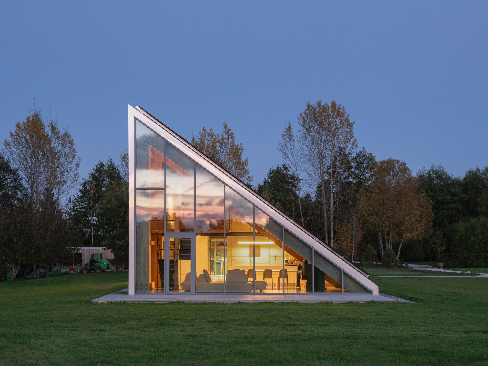 使得夾層感覺不再像是陰暗的閣樓,而是一個寬敞的觀景台。從外部看,建築保持著神秘與封閉的姿態。單坡、楔形的量體被一層均勻的「皮膚」所包覆——不鏽鋼色的三明治板。這是一個建築外殼:強壯、耐用、低維護,保護著內部豐富多樣的生活。35度的屋頂傾斜角不僅形成了一個充滿動感的剪影,更為未來的能源自主(太陽能發電)做好了準備。