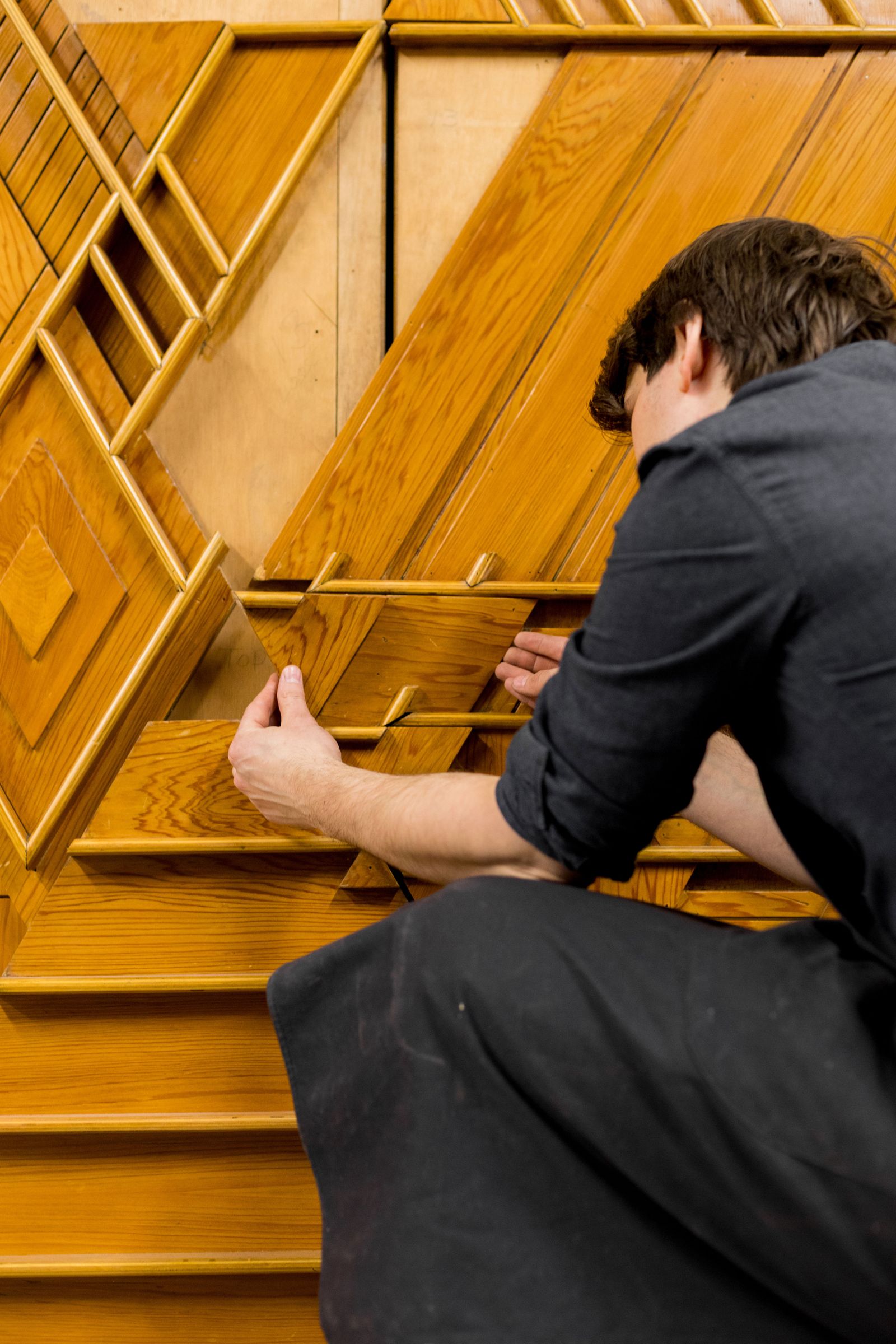 儘管這件設計是為財力雄厚的業主而作,整體構造卻選用相對簡樸的材料——如柏木膠合板與柏木飾面的木芯板——這些材質日後亦成為萊特「尤索尼亞」(Usonia) 系列住宅的標誌性元素。辦公室內既有固定式裝置家具,也包含數件可自由移動的家具作品,其造型語彙明確定義空間的長方形輪廓,進一步加強空間的秩序感與結構清晰度。家具本身擁有雕塑般的份量與形式感,但真正吸引眾人目光的焦點,仍是位於考夫曼辦公桌上方的壁面裝飾。
