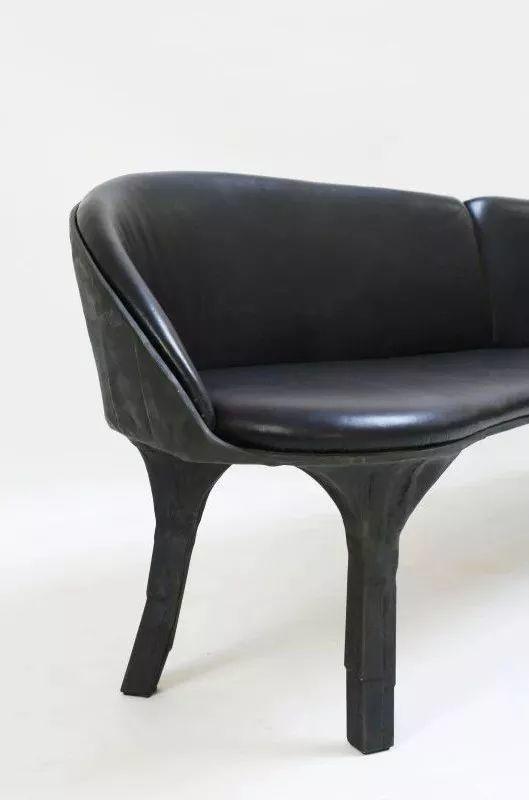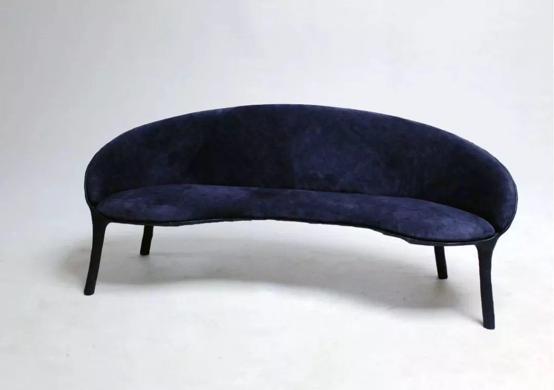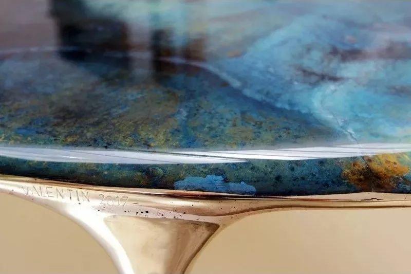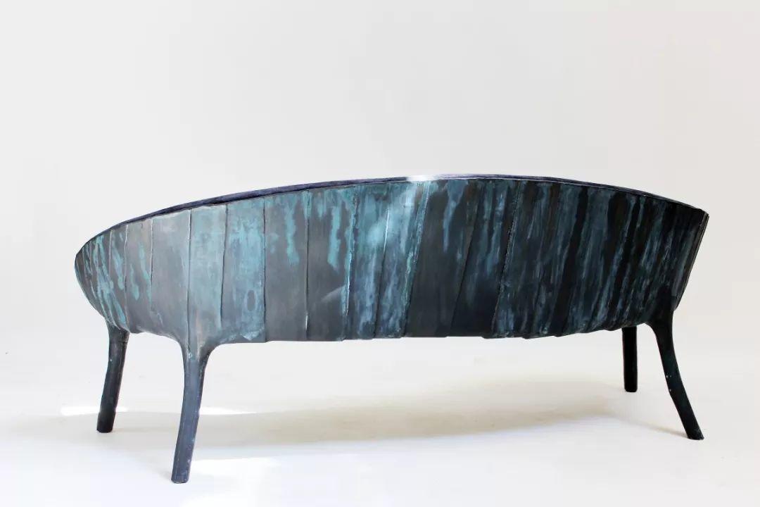 這款沙發用到了液體青銅,才有了背面斑駁的孔雀藍美景