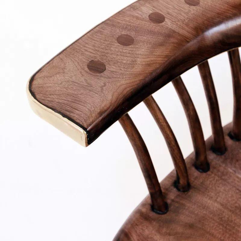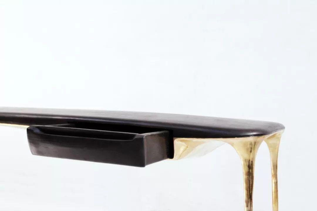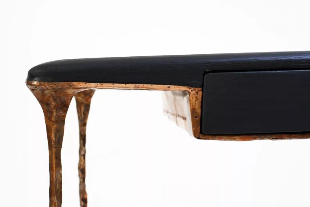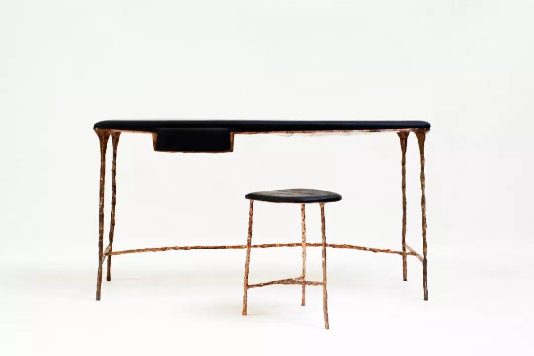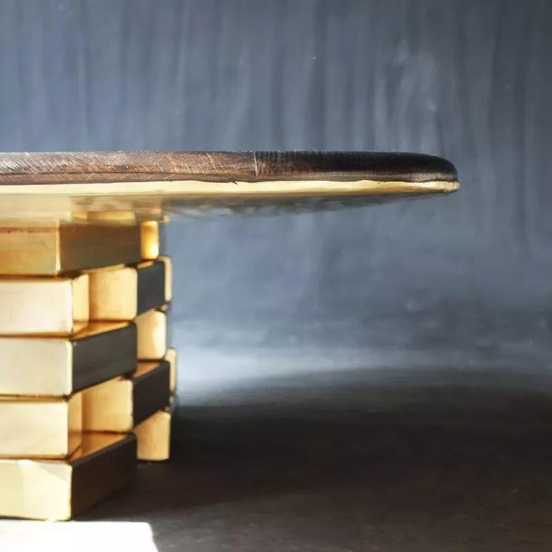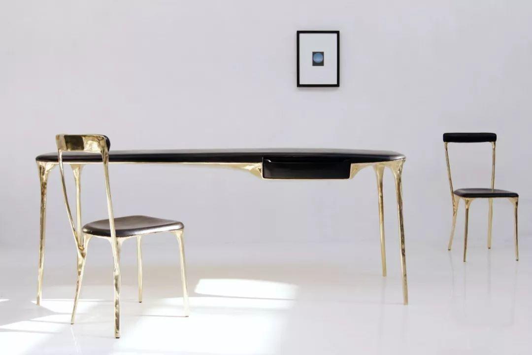 將實心黃銅板切割並銲接成框架,以支撐手工刨制的實心胡桃木、煙燻橡木,打造成長椅、書桌、椅子等等