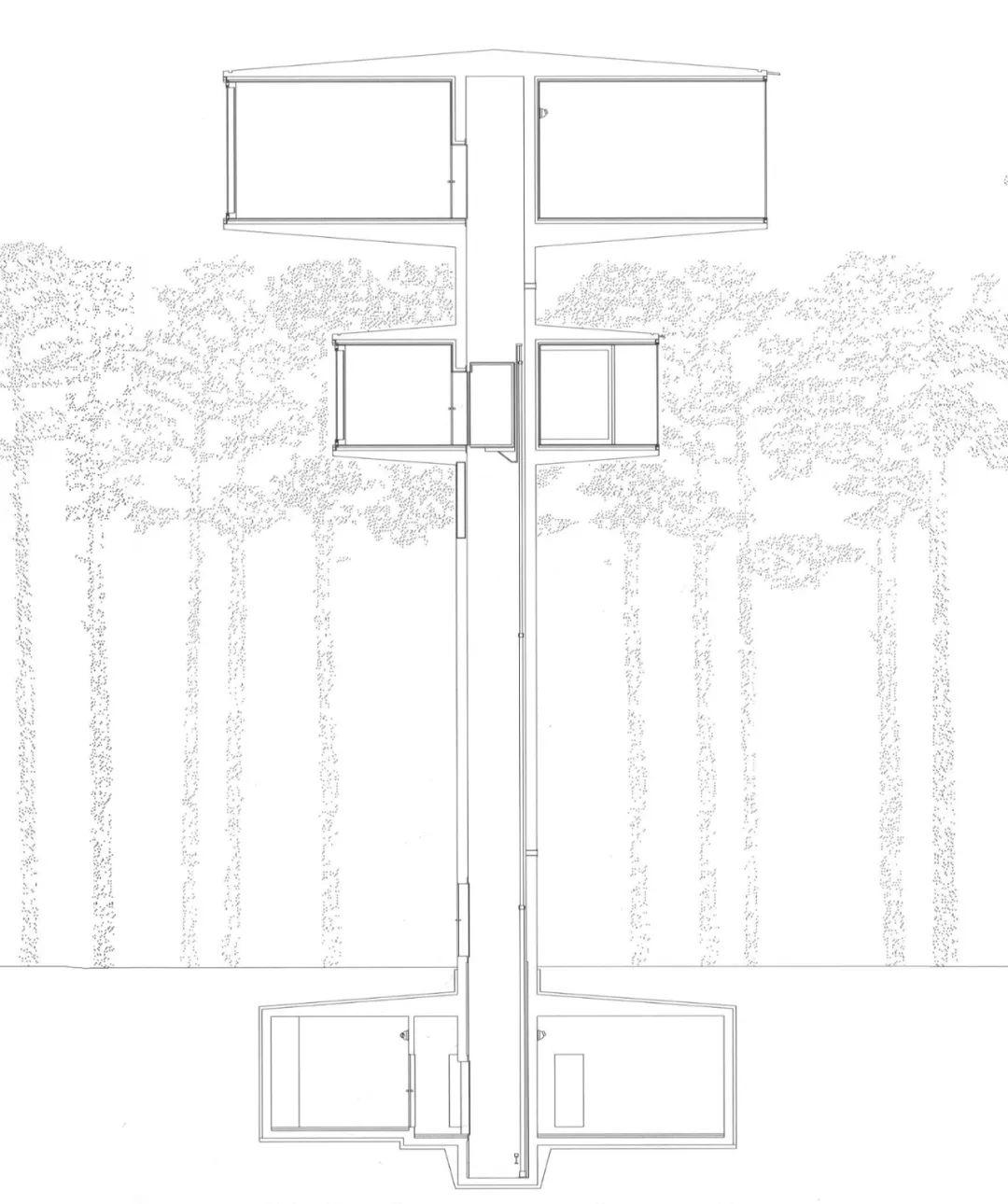建築完美地利用了松林垂直向空間的不同特質,為日常生活的不同行為活動營造了截然不同的體驗。採取電梯,而不是樓梯去串聯四個彼此之間相互獨立的空間,使得整個體驗是切換式的,完全不同於樓梯所帶來的漸變式體驗。彷彿一開門就是一個嶄新的世界。作者利用這種場景切換的手法創造出:被包裹在地下、漫步在森林的地面上、被森林的樹冠所包圍、漂浮於整片森林之上這四種不同的空間感受。