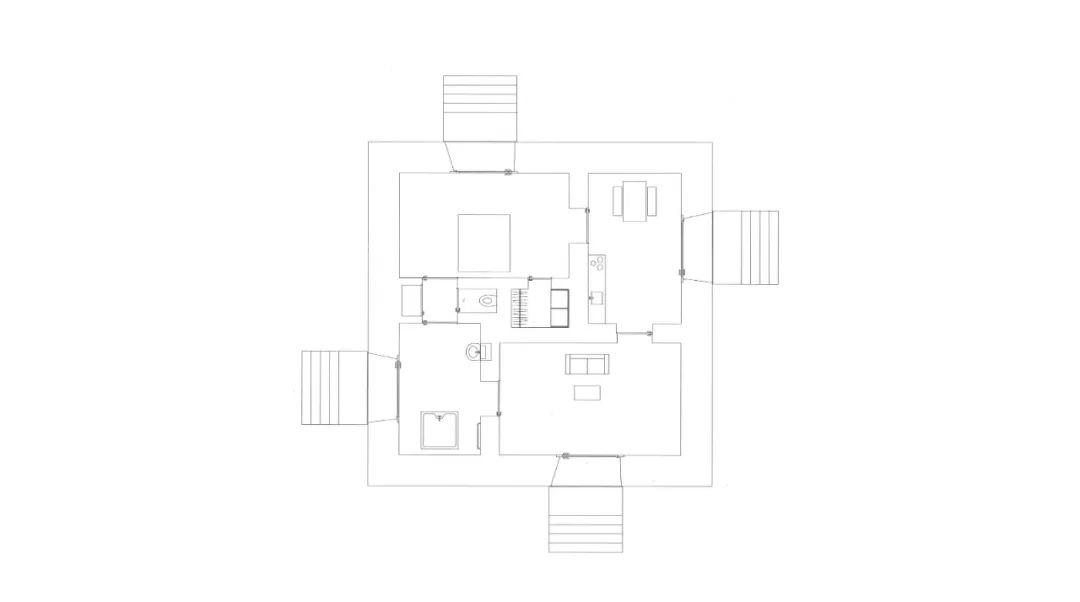 這是一個位於松樹林的住宅建築。乍一看這和我們日常生活中所見到的別墅非常不同,而更接近於Bernd und Hilla Becher鏡頭中的工業設施。整個房子分為地下和地上兩部分,地上部分在頂端由一大一小兩個飛碟狀的圓盤組成。最頂端的大圓盤位於樹冠之上,而下方較小的圓盤則被松樹林的樹冠所包裹環繞。