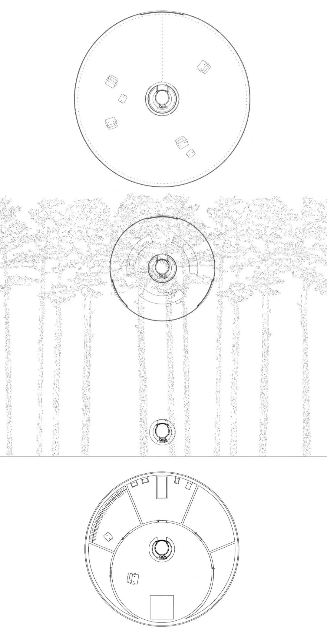 仔細閱讀平面會發現,最上層的大圓盤是住宅最主要的起居室部分,在這里視線沒有任何阻擋,週遭一覽無遺,處於其中猶如漂浮於一望無際的林海之上。下層的圓盤則是餐廳,這里空間被樹冠的綠色所環繞,寧靜而私密,伴隨著和風微拂的綠葉和斑駁的光影享受一頓美味的午餐,想必是美妙的體驗。臥室處於森林中最私密的地下,同時這個房間也是整個建築的基礎。雖然外形奇特,但是卻十分合乎情理,幾乎是為所處的松林的環境所特別客製化的。