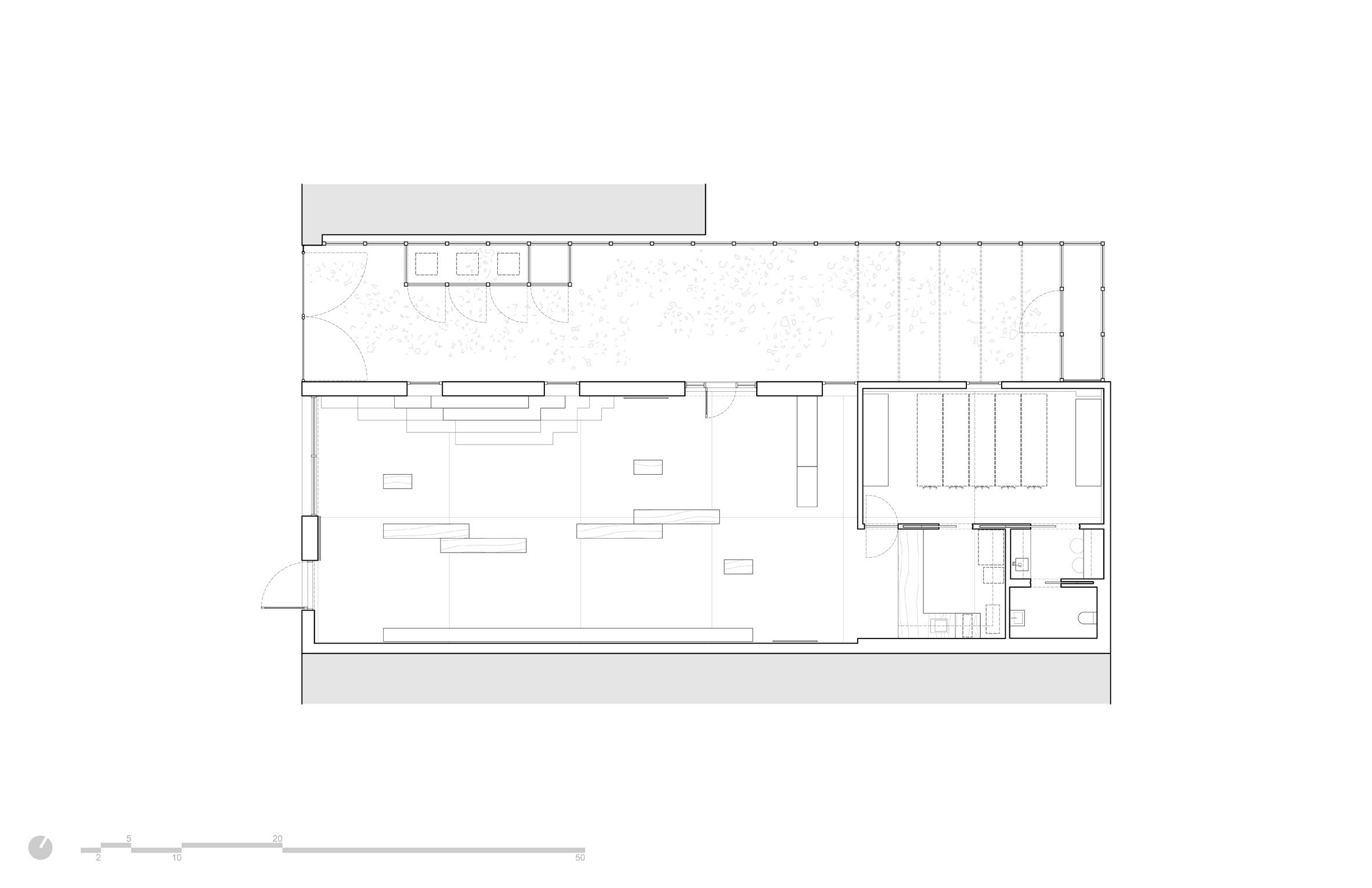 Office JDY 對於材質的運用和處理,可說是匠心獨運。他們大膽地保留了這棟單層建築原有的紅磚牆、混凝土牆,以及部分牆面斑駁的石灰粉刷層,使其露出歲月的痕跡,展現質樸況味。其中有兩面牆,更是刻意維持著建材的原始樣貌,與室內新穎的白色陳列架形成強烈對比,卻又在視覺上取得微妙平衡。