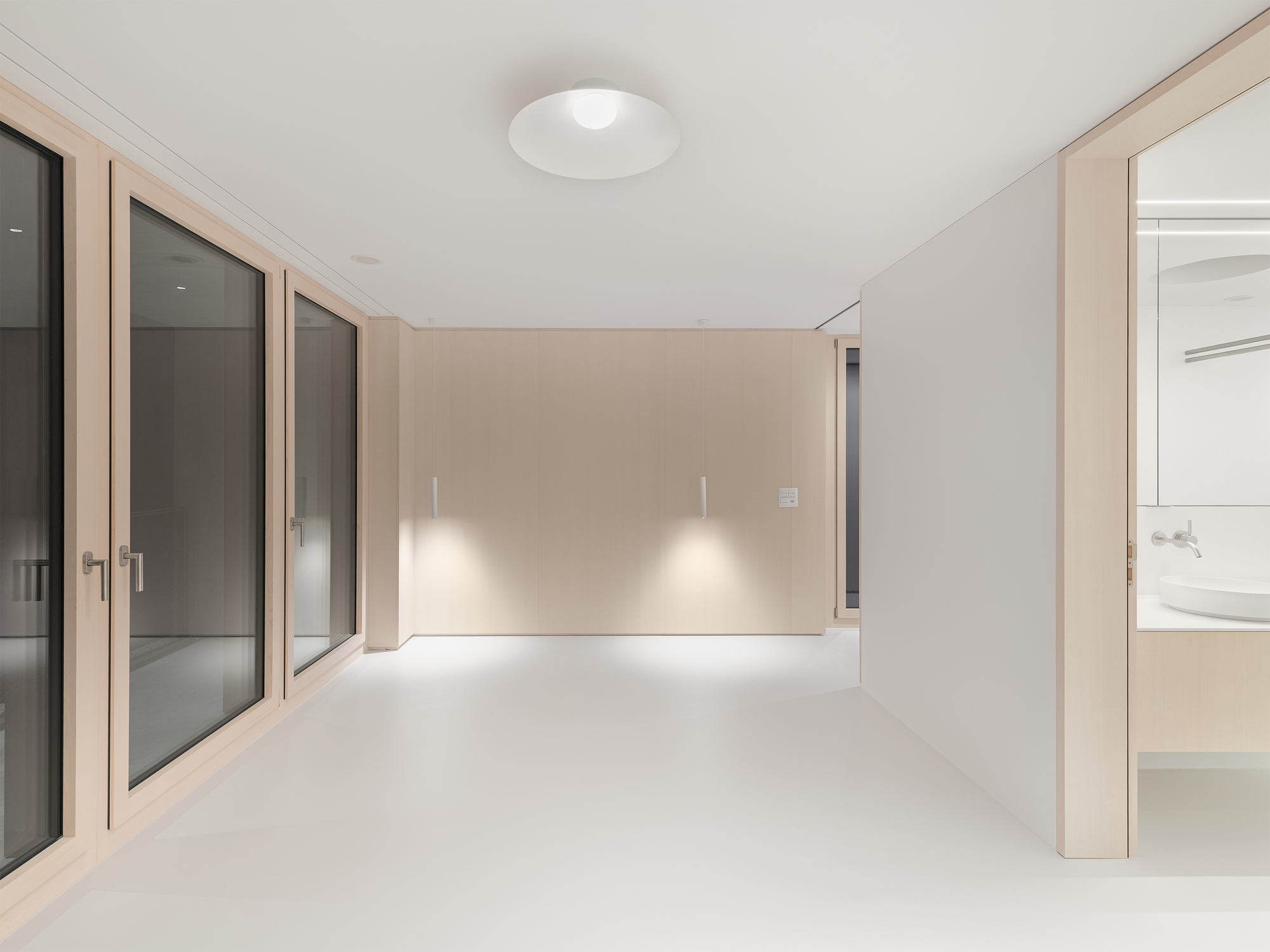 相較於粗獷且充滿風土氣息的外觀,室內空間則刻意保持極簡與純粹。無縫的白色地板、刷白的天然木材表面,以及潔白的灰泥牆面與天花板,共同營造出一種寧靜致遠的氛圍。這種克制的室內設計策略,旨在將居住者的視覺焦點引導至寬闊的窗外,讓山谷的壯麗景色與森林的四季流轉成為空間中真正的主角,透過光影的變化,讓居住者在日常生活中深刻感知時間的推移。