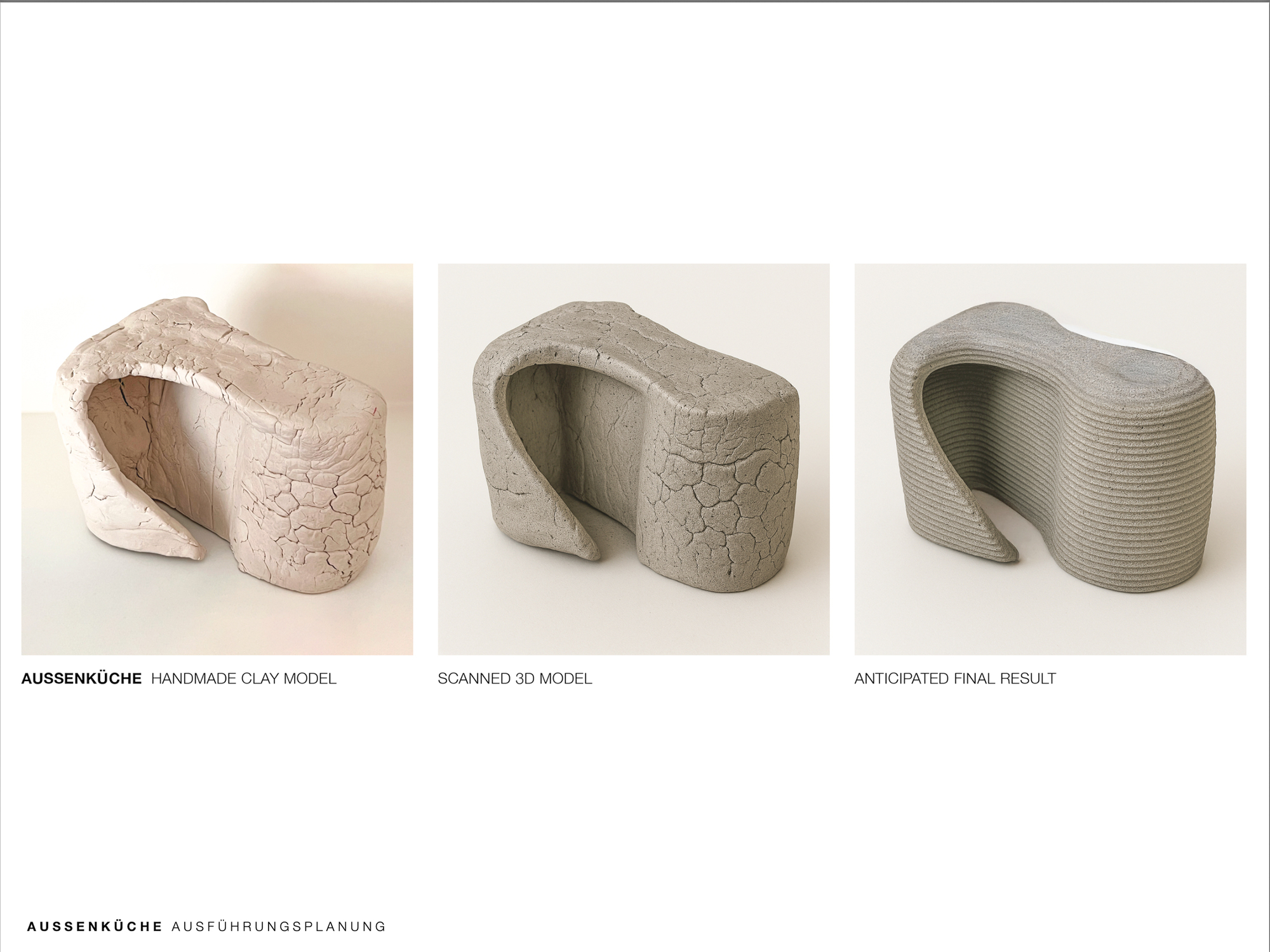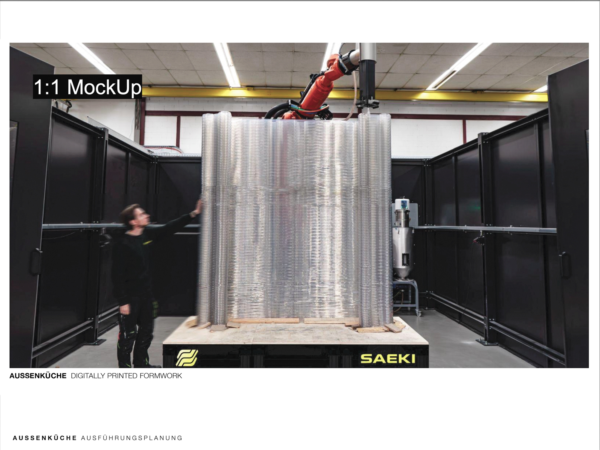 Winkelhaus 的創新精神並未止步於建築主體,它更延伸至對未來營建技術的探索。預計於 2026 年完成的戶外廚房,將是 estudio kmmk 與機器人產業及蘇黎世聯邦理工學院(ETH Zurich)研究人員合作的結晶。這個「案中案」將最古老的人類藝術形式——手工雕塑,與最前衛的數位製造技術——3D列印模板(3D-printed formwork)相結合。