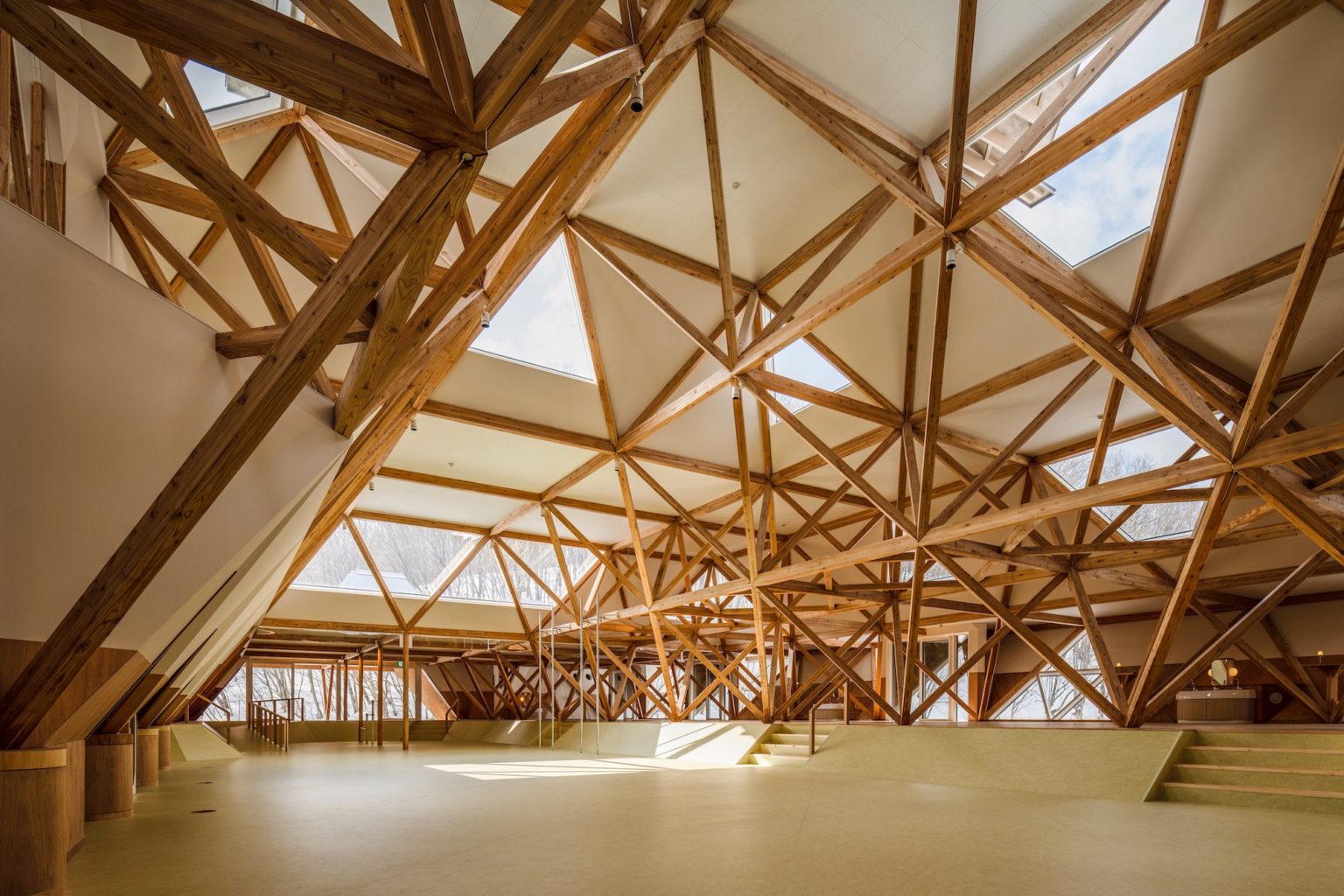 建築團隊在這次的設計中,大膽選用了北海道在地木材「カラマツ」(唐松、落葉松,這種木材不僅在當地取得容易,無須從遠處運輸而來,可大幅減少因交通而造成的碳排,除此之外,「カラマツ」木材堅固的結構特性更是理想的建築素材。幼兒園的核心結構由立體桁架系統組成,設計基礎為3.3公尺見方的正四角錐單元,這種幾何形態的選擇不僅讓整體空間更具韻律感,也在視覺上營造出層次分明的建築效果。唐松木材被切割成120毫米見方的柱材,並搭配尺寸為120×180毫米的橫樑,這些規格經過嚴格的結構計算,既能確保建築的穩定性,同時也維持了空間的輕盈感。更重要的是,木材本身散發的溫暖質感與自然氣息,為幼童提供了一個能與環境親密互動的場域,使他們在探索與學習的過程中,感受到自然的力量。