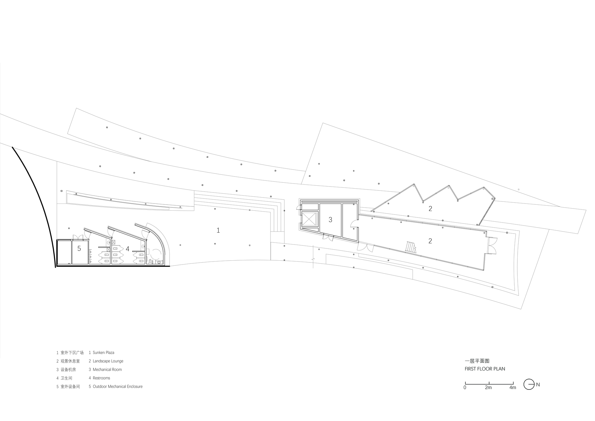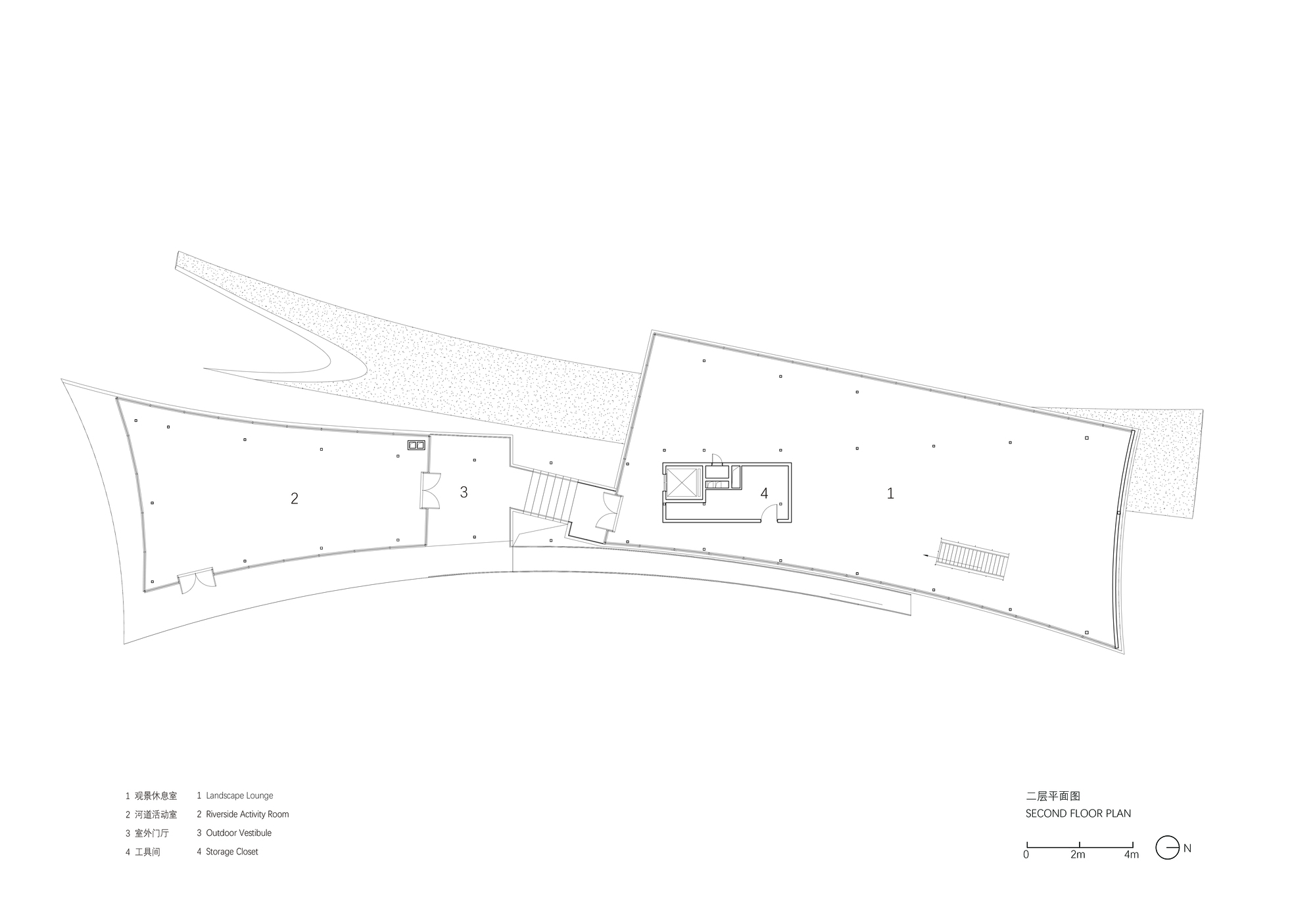 一介建築深信,公園建築是對公共生活的一種深度探討。在4號建築中,設計師試圖將隱藏在城市背後的生活線索顯性化,轉化為具備生機的公共空間。透過多重流線的交錯與匯聚,建築內部的商業機能不再是封閉的孤島,而是與外部景觀持續滲透的開放場域。人們可以自然地順著地勢進入空間,在層疊的走廊間漫遊,從一層蜿蜒至二層,最終又回歸自然。這種連續性的空間體驗,打破了全季節、全天候的使用限制,讓室內空間與戶外綠地能夠積極協同,為市民提供了一個充滿活力的活動場所。商業在此不僅是服務個體消費,更昇華為城市公共生活的一部分,編織出一幅真實且充滿人情味的都市生活圖景。