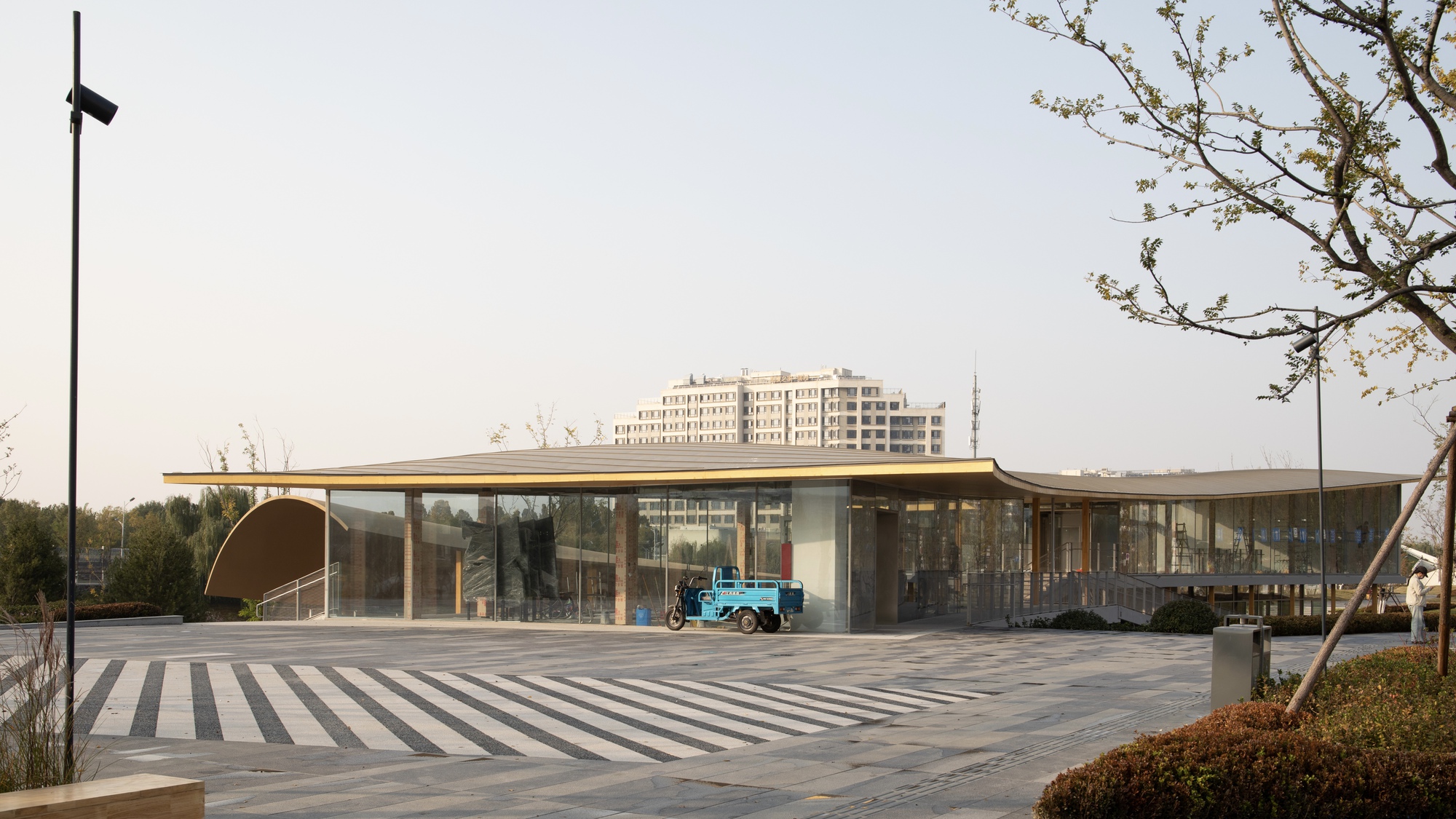 位於中國山東省濟南市高新東區核心地帶,名為「楊家河附屬綠化提升工程」的都市針灸計畫正悄然改變著當地的地景風貌。其中,由一介建築擔綱設計的「4號建築」,不僅是楊家河彩虹湖系列小建築群的一員,更是回應濟南東區建設指揮部對於提升區域城市品質與創新活力政策要求的具體實踐。